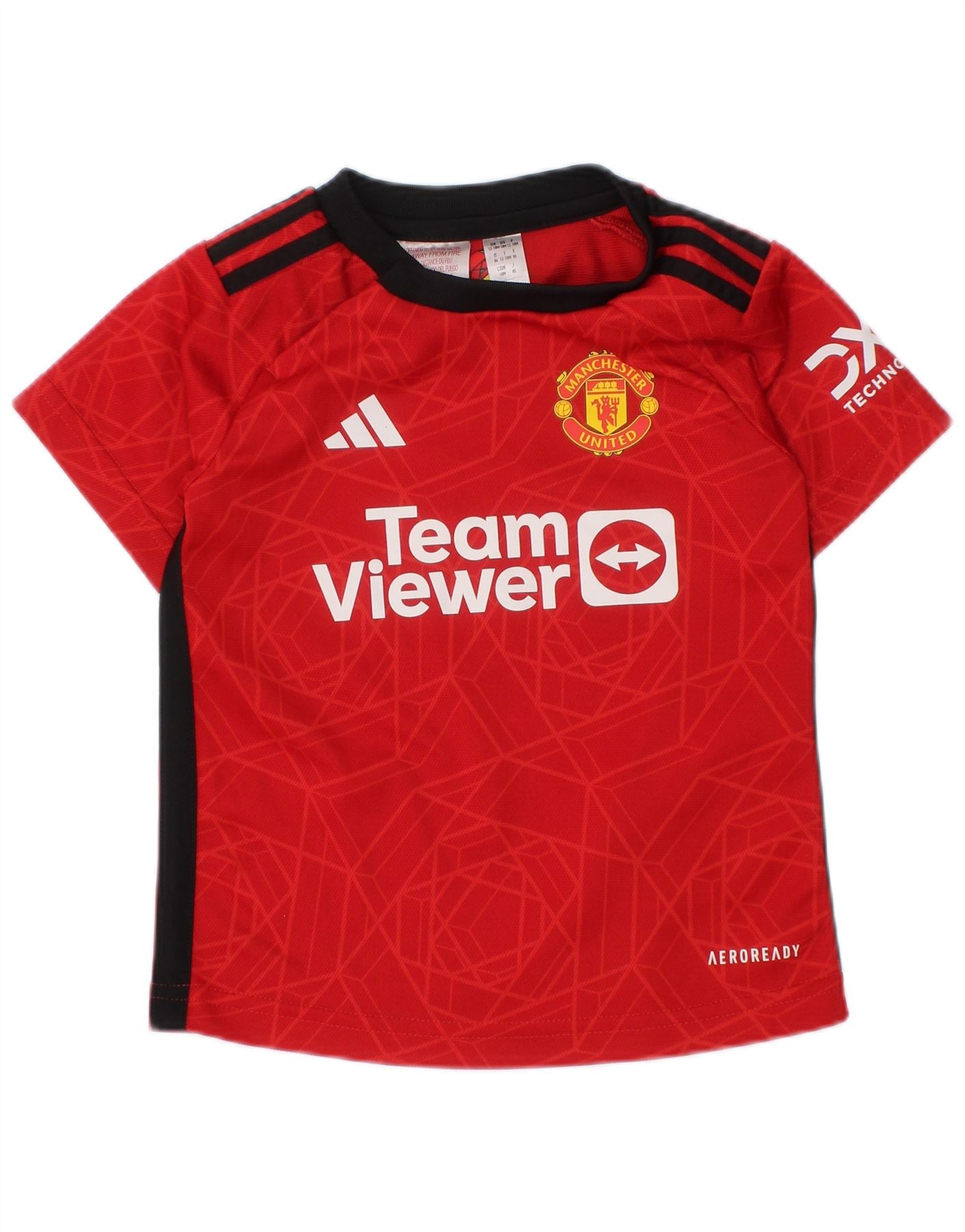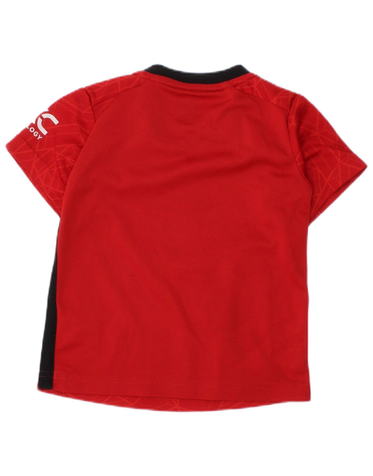 - AI Description: This Adidas baby boys' jersey top is crafted from 100 percent recycled polyester jersey. It offers a lightweight and breathable feel. The round neck and short sleeves ensure a comfortable, regular fit. A simple pullover design makes it easy to wear. It features a bold geometric pattern in red. The Manchester United logo is prominently displayed, reflecting its football style.