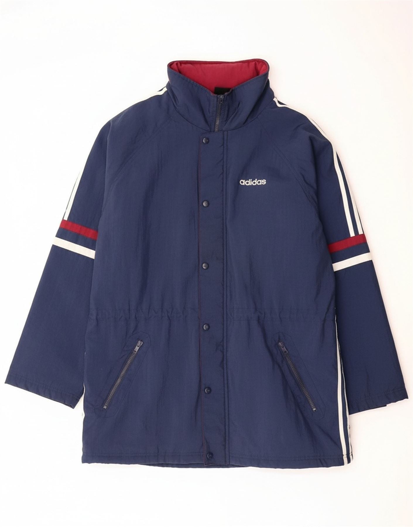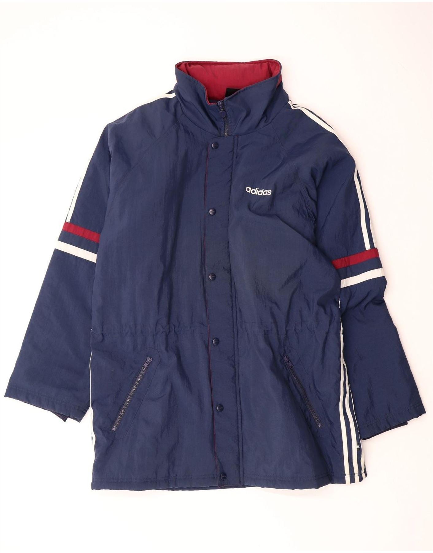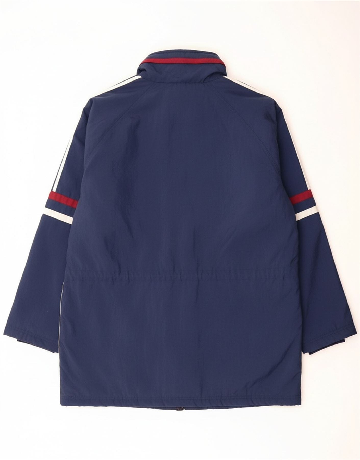 - AI Description: This Adidas mens Windbreaker Jacket is presented in a versatile navy blue woven fabric. It features a regular fit and a practical full zip closure. The padded construction offers added warmth. A collared neckline and long sleeves provide coverage. It includes a functional hood and an elasticated waist for a comfortable fit. Distinctive striped detailing and a visible logo accent add classic Adidas styling. Pockets offer added utility.