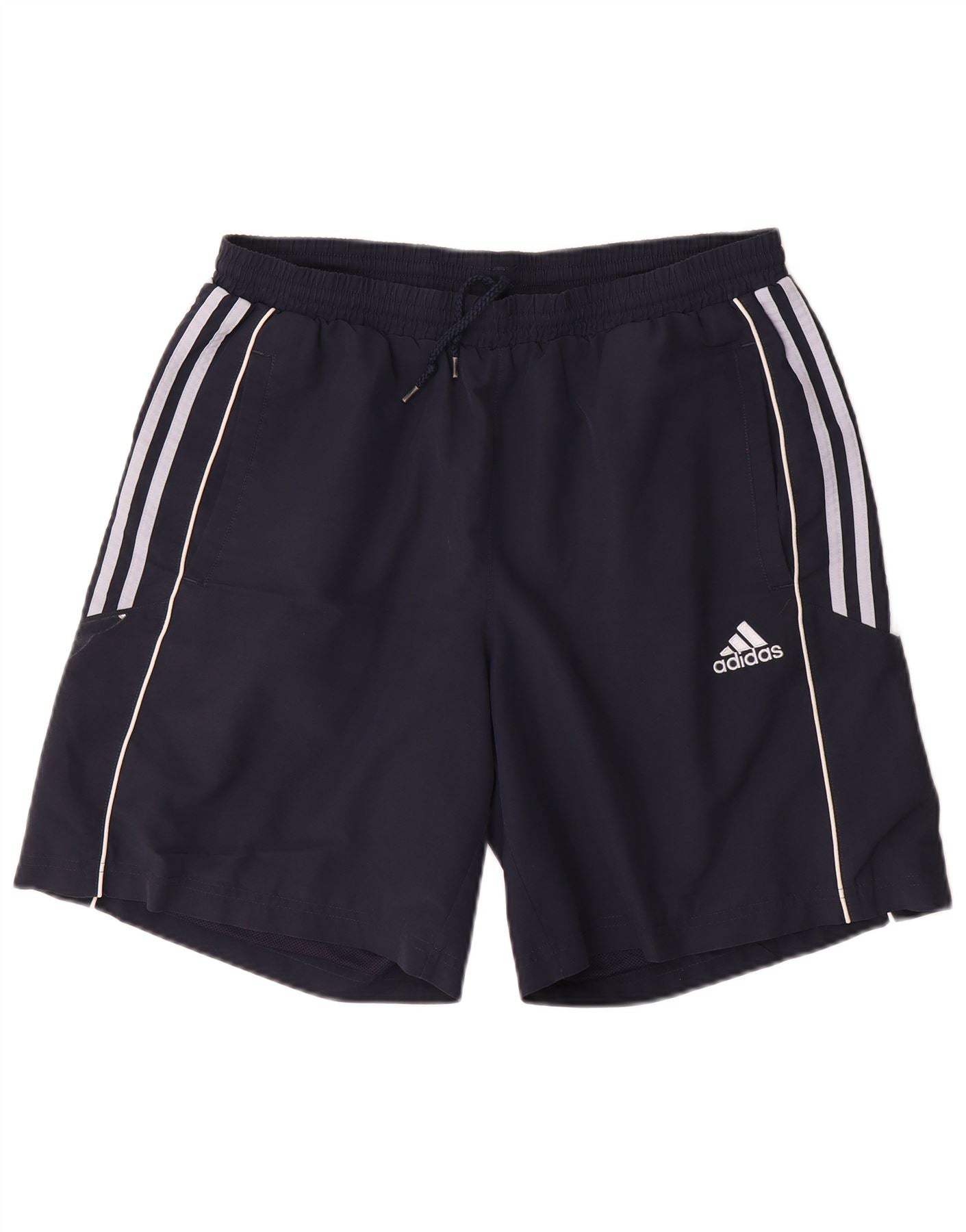 - AI beskrivelse: Disse Adidas herreshorts er lavet af let marineblåt polyestervævet stof. De har en elastisk snøre i taljen for en justerbar, behagelig pasform. Det atletiske snit sikrer nem bevægelse. Tre hvide striber løber ned langs siderne, en klassisk mærkedetalje. Et subtilt Adidas-logo er trykt på benet. Sidelommer tilføjer praktisk funktionalitet.