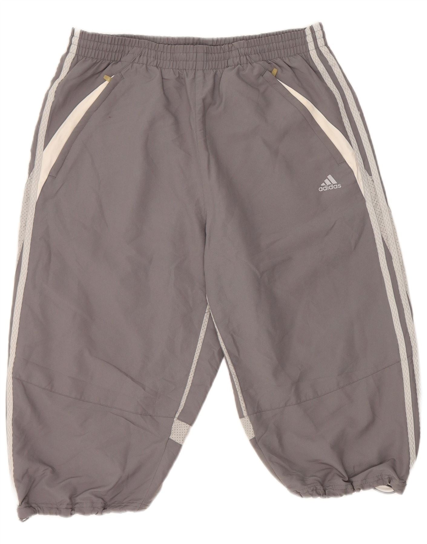 - AI beskrivelse: Denne Adidas herre cropped buks er lavet af et gråt vævet stof, der tilbyder en glat tekstur. De har en afslappet, løs pasform med en elastisk pull-on talje for komfort. Designet inkluderer praktiske lommer og et helt for. Hvide striber løber ned langs siderne, der komplementerer Adidas-logoet. Den afkortede længde afsluttes med en elastisk søm, ideel til træning.