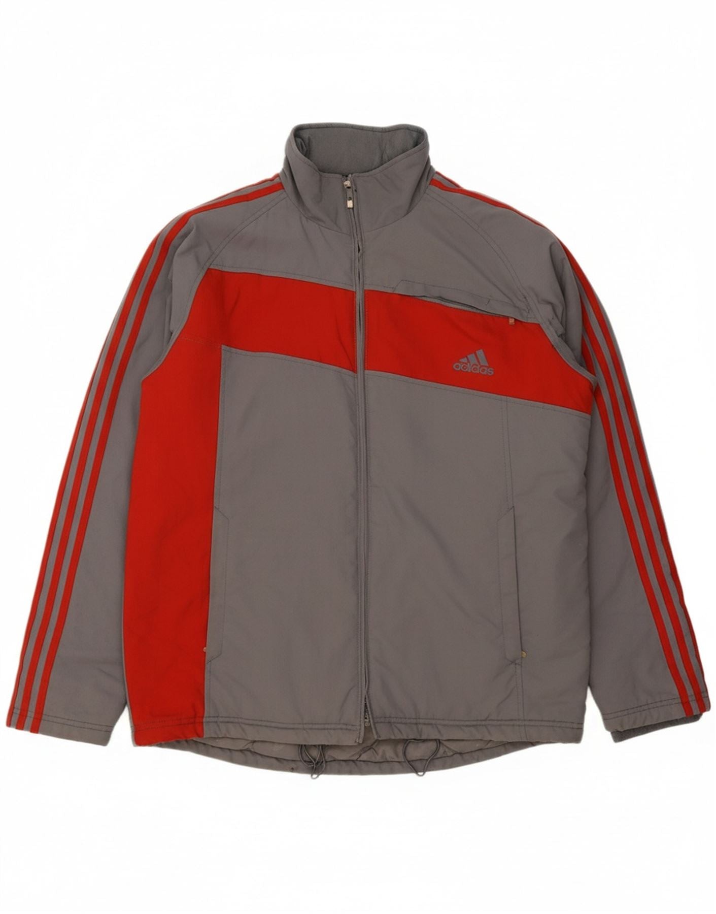 - AI Description: This Adidas mens padded jacket is crafted from a durable grey polyamide shell. Its woven texture and padded fill offer warmth and protection. A full zip closure extends to a mock neck for added coverage. The regular fit and long sleeves ensure comfortable wear. Practical pockets and an adjustable waist enhance functionality. A colourblock pattern and logo detail complete the sporty design.