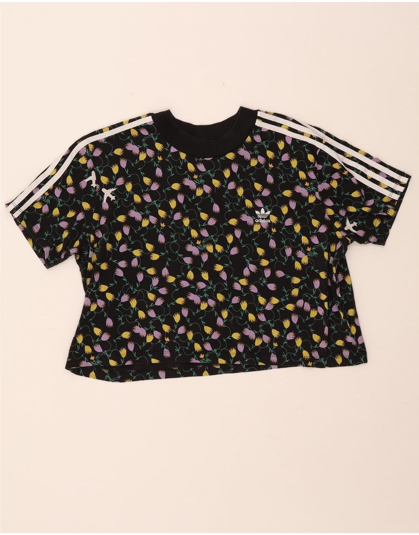 ADIDAS Dame Crop Grafisk T-Shirt Top UK 18 XL Sort Blomster Bomuld