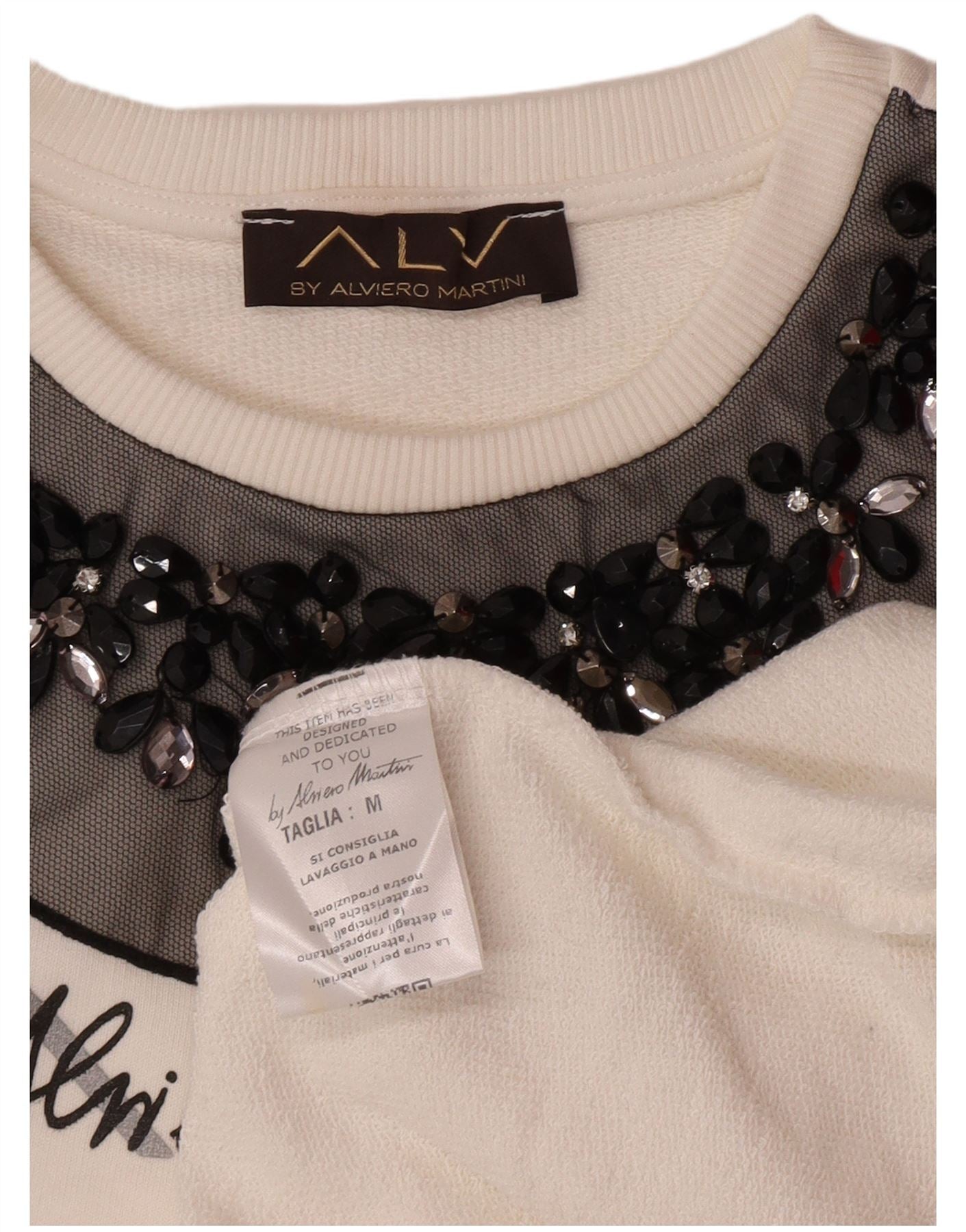 ALVIERO MARTINI Dame Grafisk Sweatshirt Jumper UK 14 Medium Hvid Bomuld