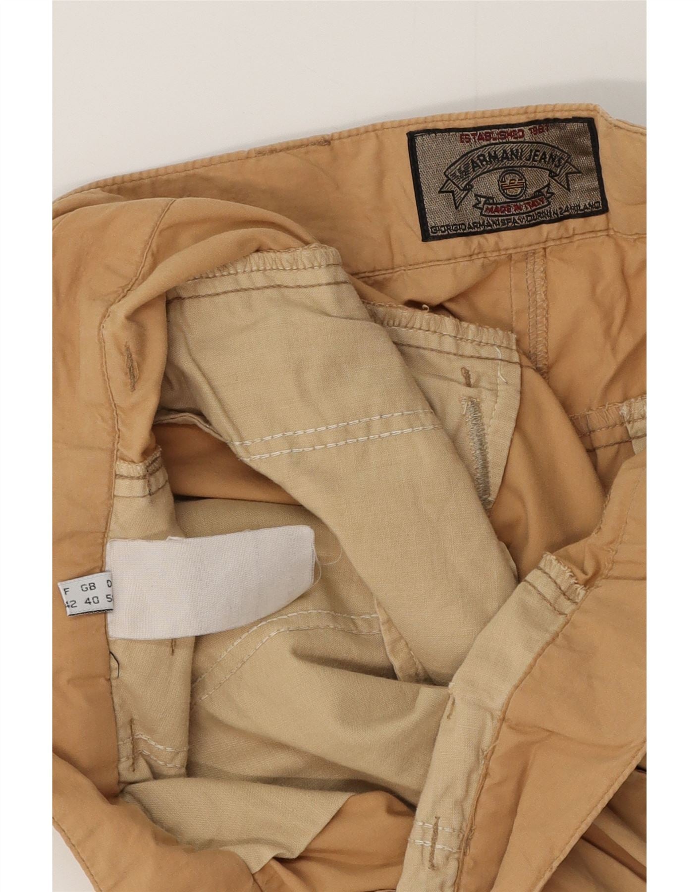 - AI Description: These Armani Jeans mens cropped trousers are crafted from a beige woven fabric. They feature a relaxed fit, offering comfort and ease of movement. The button closure provides a classic finish. Practical pockets are included, alongside a stylish belted detail. The cropped length adds a modern touch to this classic style.