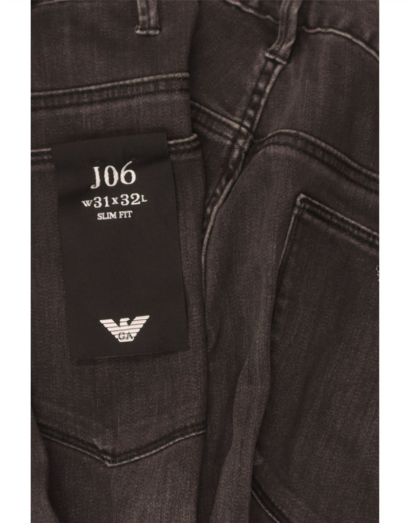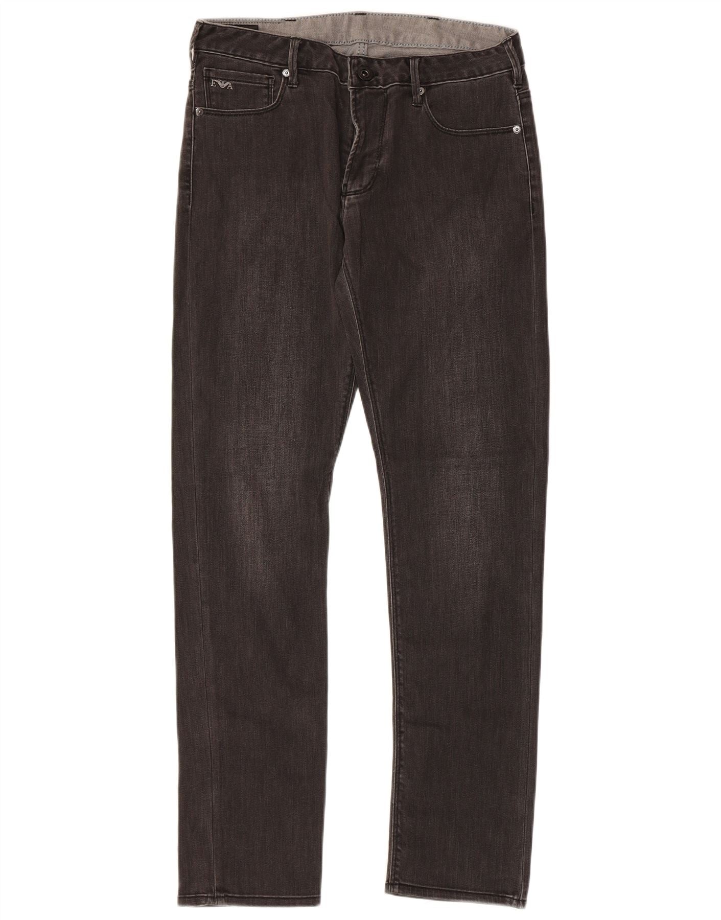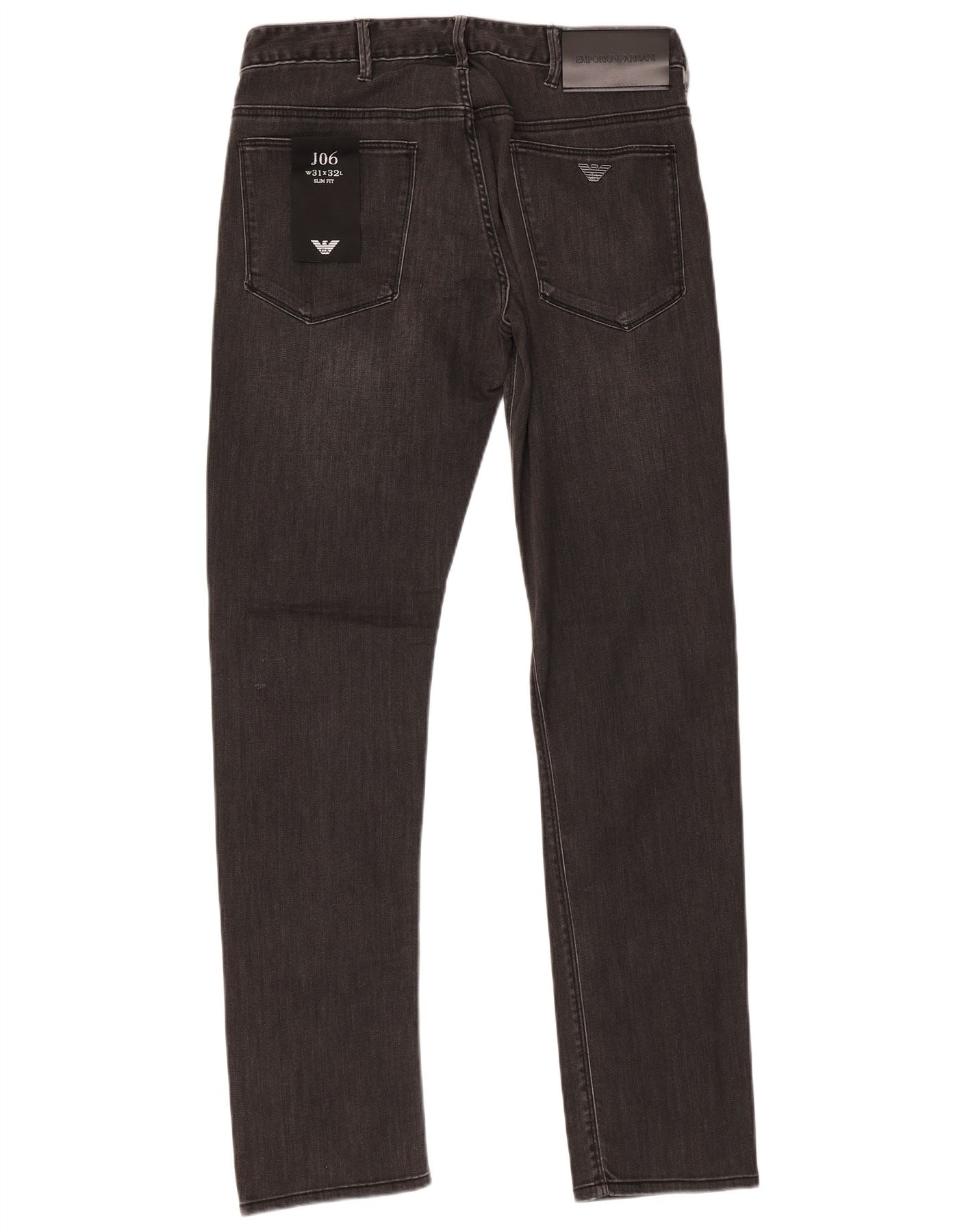 - AI Description: These Armani mens slim jeans are crafted from grey denim with a modern, sleek finish. The denim offers a comfortable stretch. They feature a slim fit through the leg, tapering subtly to the ankle. A button closure secures the front. Classic five-pocket styling provides practicality. A subtle logo accent adds a signature touch. This modern style is versatile for everyday wear.