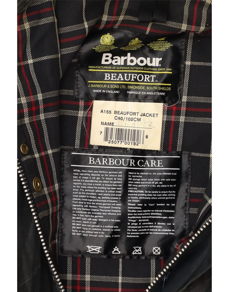 - AI Description: This Barbour mens waxed cotton jacket is crafted from durable, water resistant woven fabric in navy blue. It features a classic collared neckline and long sleeves. The jacket includes a practical hood and a button closure. A subtle plaid pattern adds traditional charm. Multiple pockets offer functionality. A discreet logo provides brand recognition. The regular fit ensures comfortable wear, perfect for classic style.