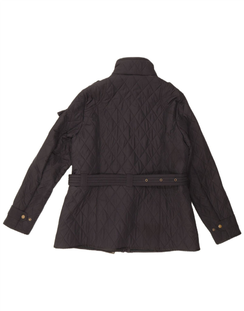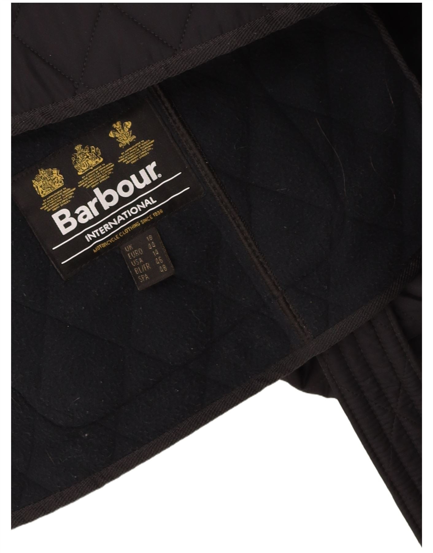 - AI Description: This Barbour womens quilted jacket is crafted from a woven fabric in classic black. Its quilted design adds texture and warmth. It features a collared neckline and long sleeves. The regular fit offers comfortable wear. A full zip closure secures the front. Practical pockets provide storage. A belted waist enhances the silhouette. The biker style gives it a contemporary edge.