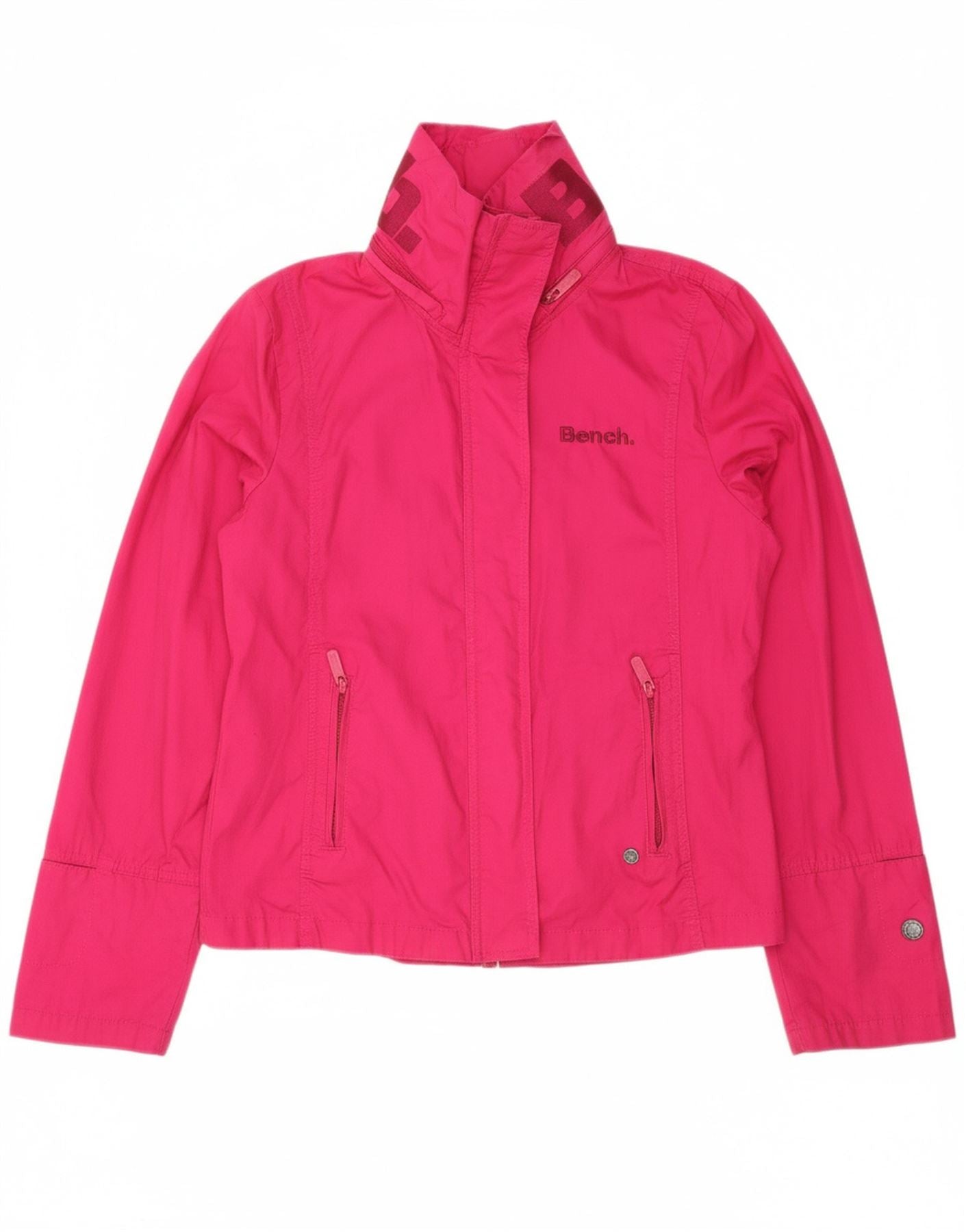 • AI Description: This Bench womens Windbreaker Jacket is crafted from lightweight woven cotton. Its vibrant pink hue adds a fresh touch. A high neck and long sleeves provide ample coverage. The full zip closure ensures easy wear. It features a regular fit for comfortable layering. Zipped pockets offer practical storage. A subtle logo accent completes the design. This jacket is also waterproof, ideal for unpredictable weather.