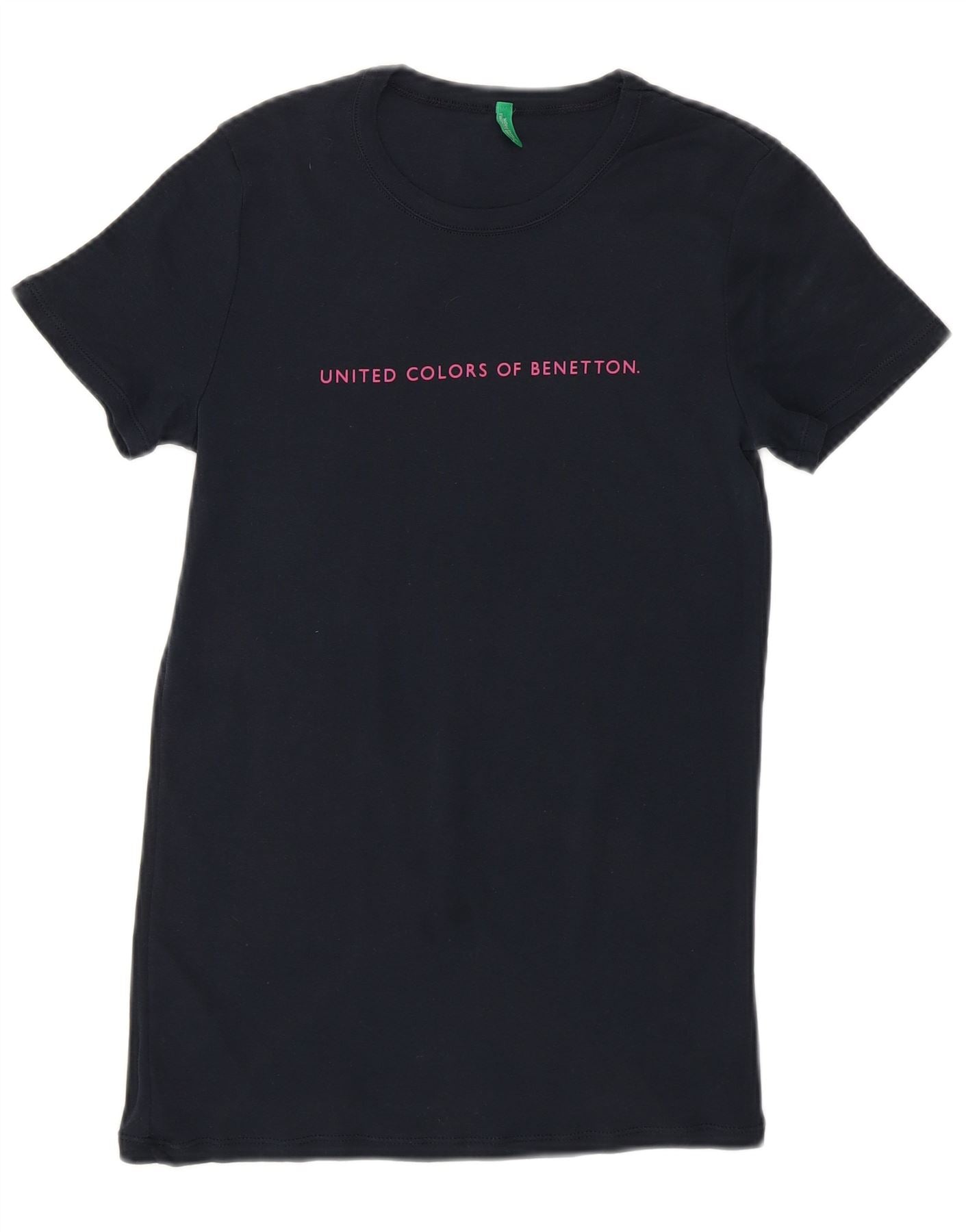 Home > Vintage Benetton tøj > Kvinders > BENETTON Grafisk T-shirt top til kvinder UK 12 Mellem marineblå bomuld
