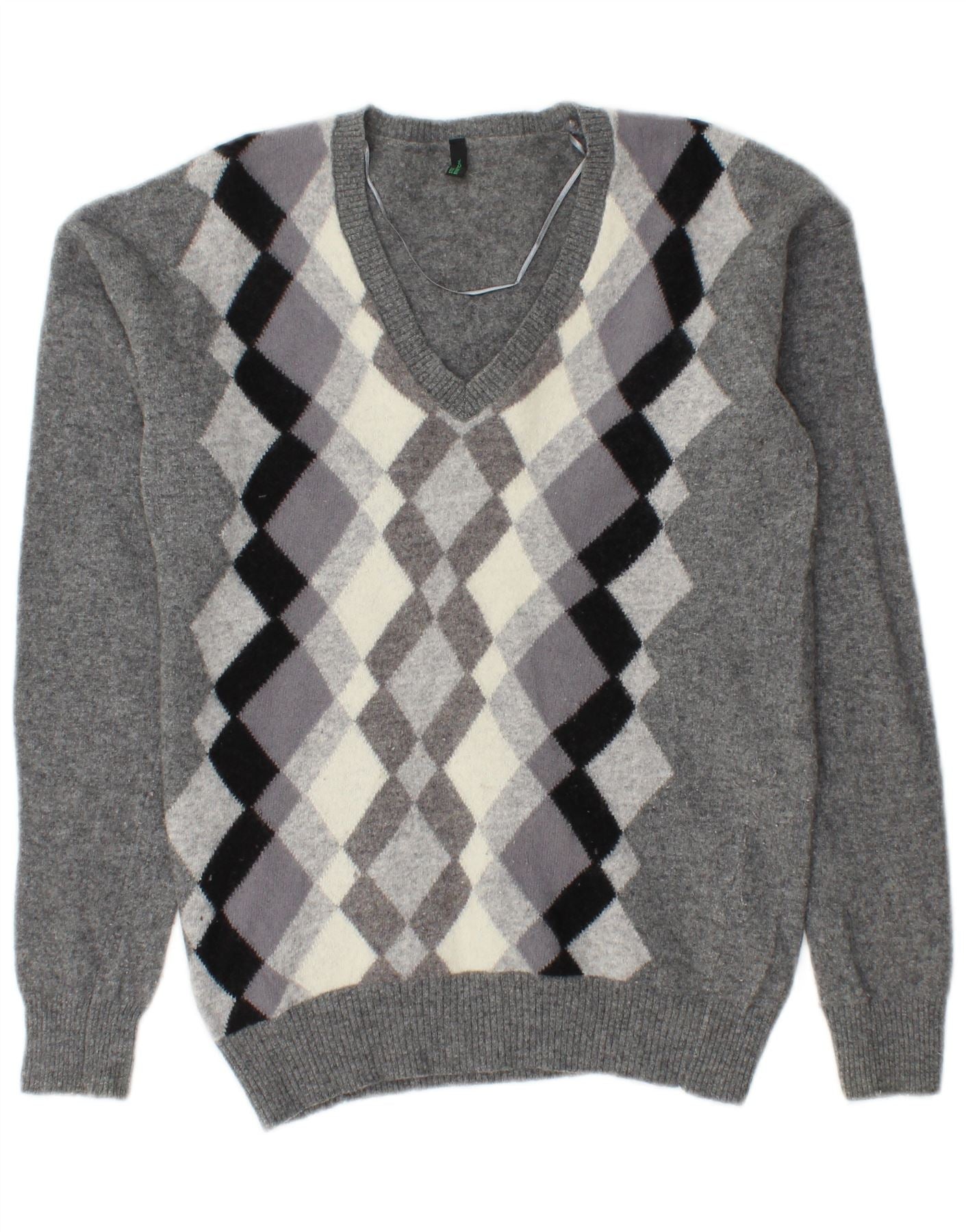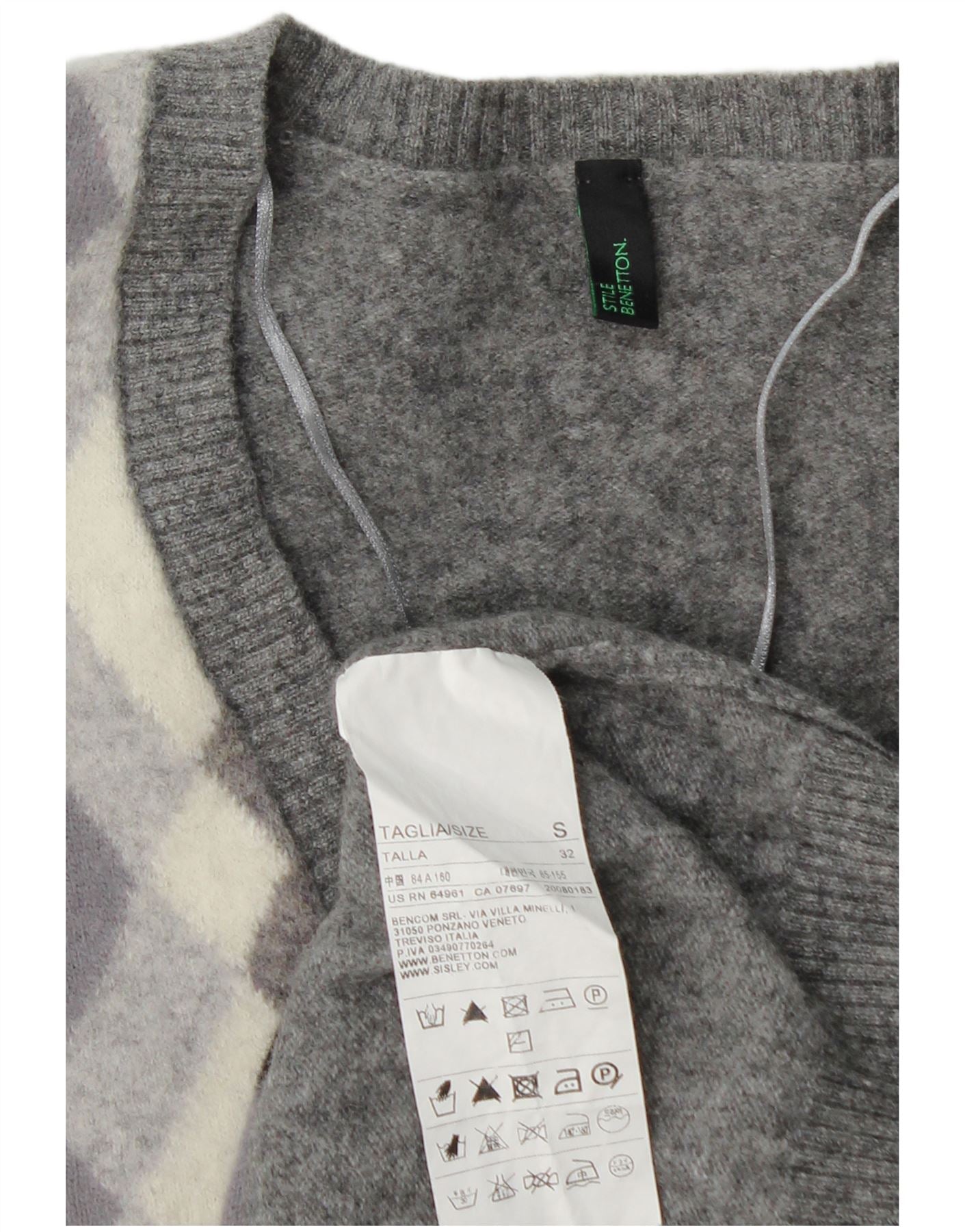 BENETTON Dame V-hals sweater UK 10 Small Grey Argyle/Diamond Wool