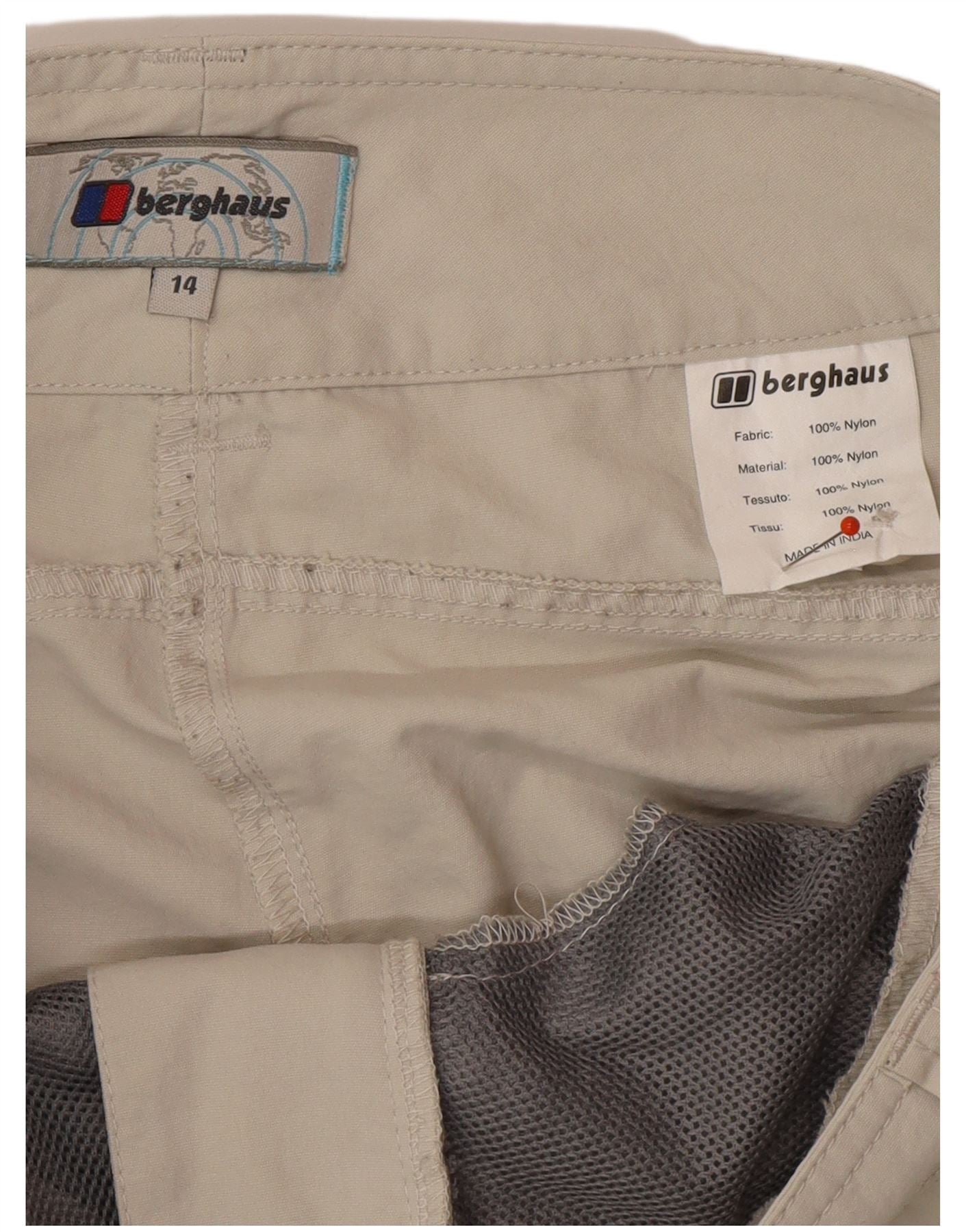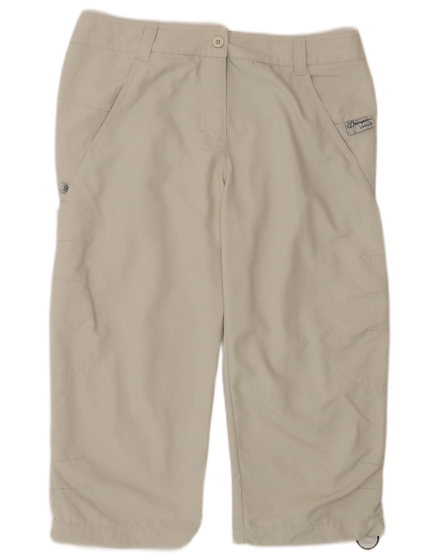 - AI Description: These Berghaus womens Capri Trousers are crafted from lightweight 100 percent nylon woven fabric. They feature a comfortable mid rise and a regular fit. The button closure ensures a secure wear. Practical pockets offer convenience. An adjustable design provides a custom fit. A subtle logo accent completes the sporty style. Their beige colour makes them versatile for various activities.