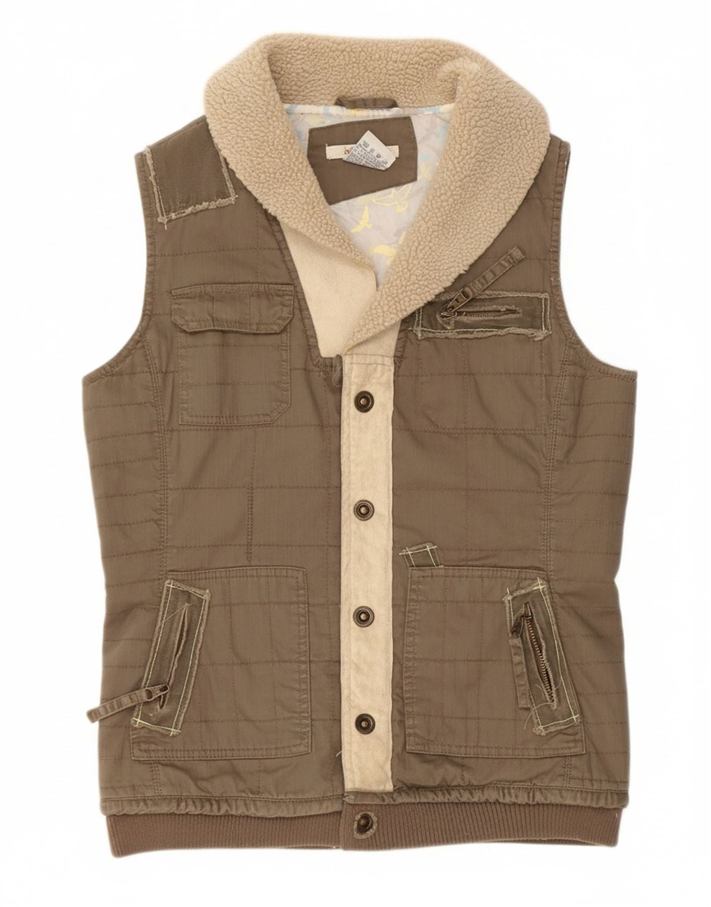- AI Description: This Billabong womens waistcoat presents a sophisticated look in khaki woven cotton. It features a smart collared neckline and a neat button-up front. The sleeveless design ensures versatile layering. A quilted polyester lining provides warmth and subtle texture. Functional pockets add practicality. This regular fit waistcoat is fully lined and includes an adjustable back, ensuring a comfortable, tailored silhouette.