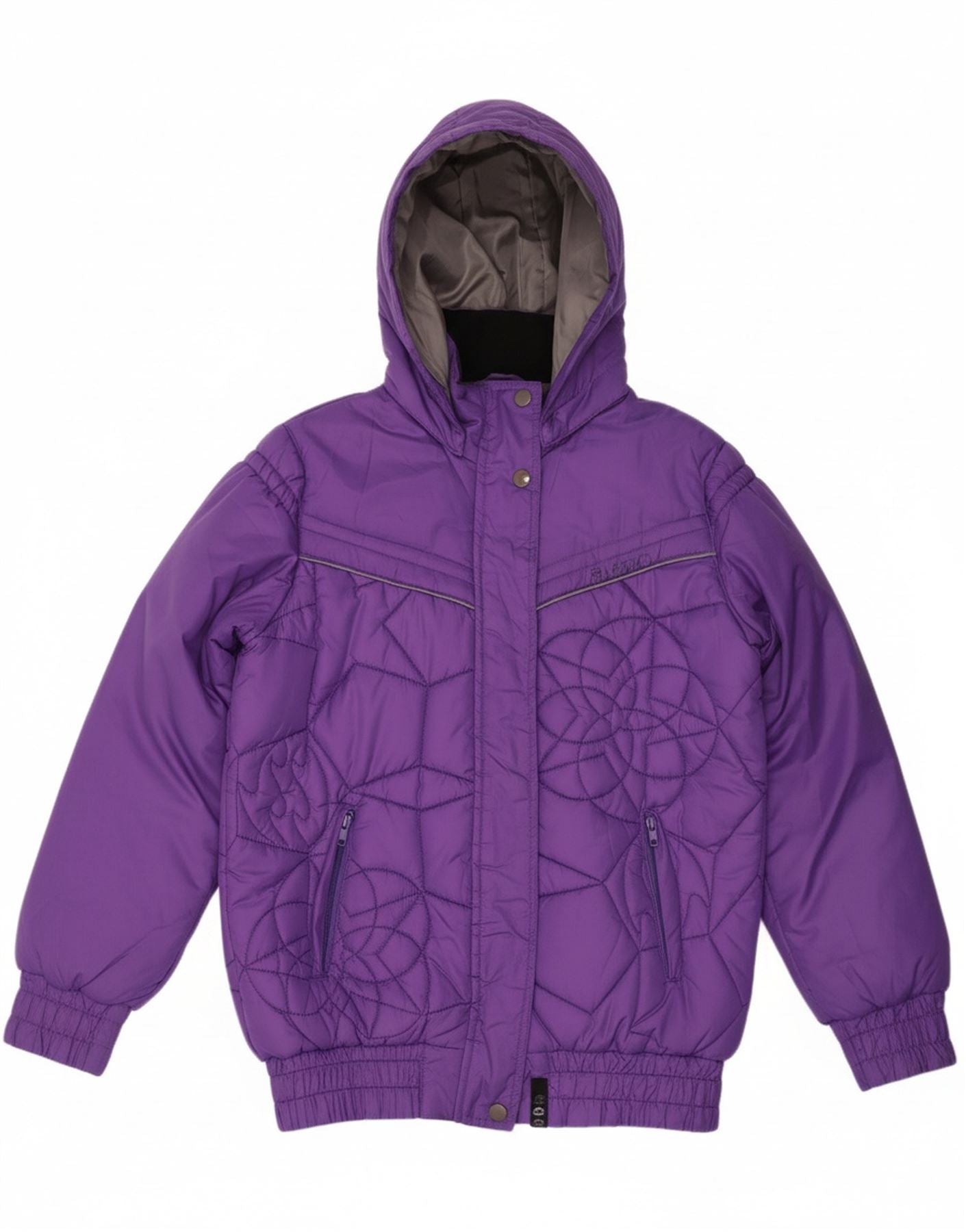 - AI Description: This Billabong womens padded jacket offers warmth and style for winter. It features a woven purple fabric with a distinctive quilted geometric pattern. The high neck and hooded design provide extra protection from the elements. A full zip closure secures the regular fit. Long sleeves and practical pockets complete this windproof ski jacket.
