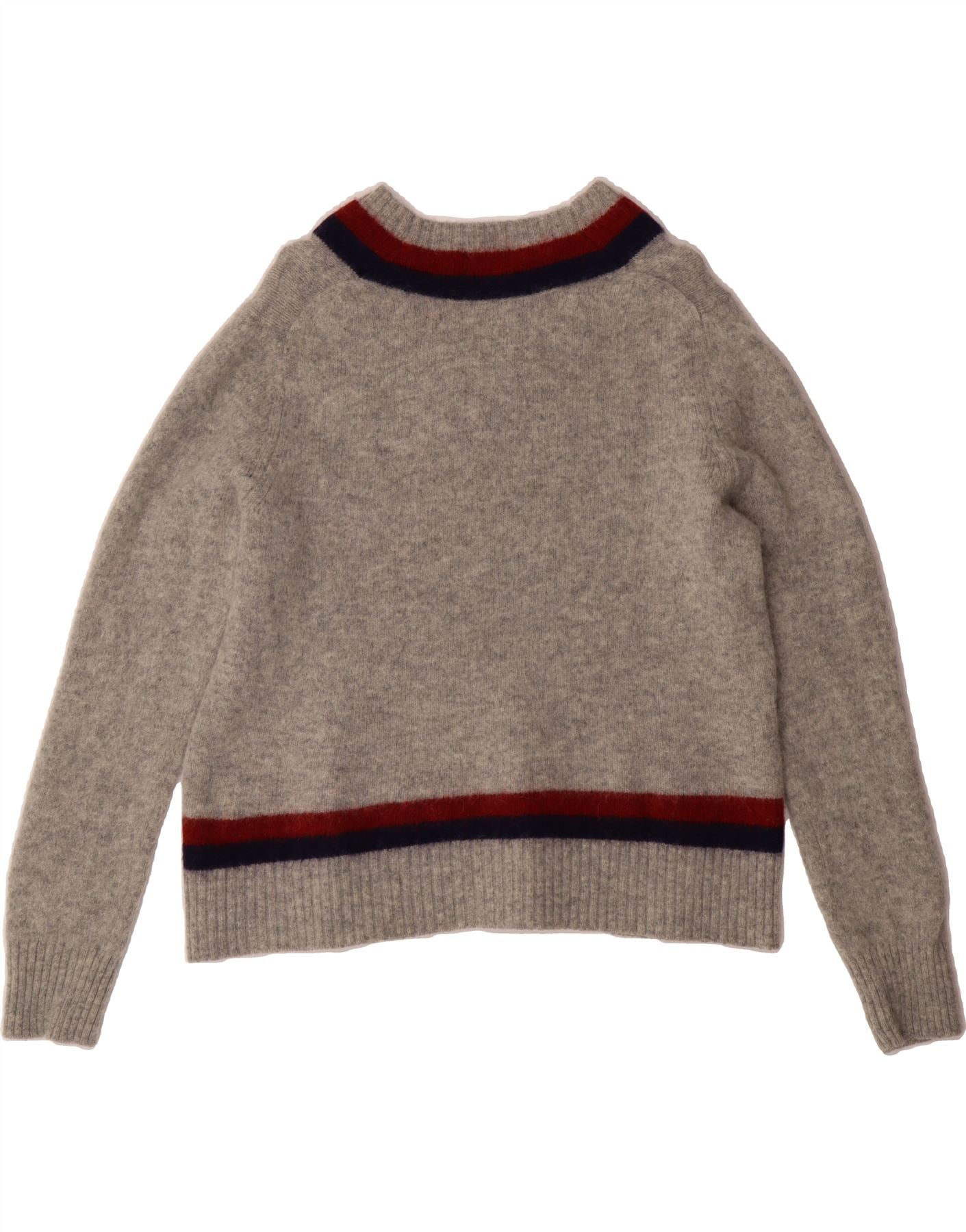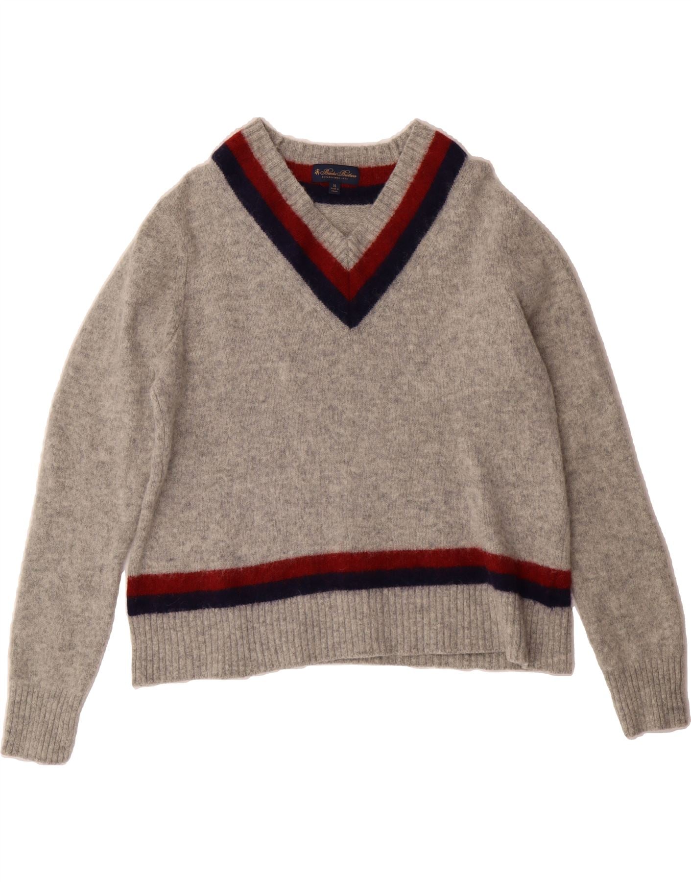- AI Description: Elevate your wardrobe with this pre-owned Brooks Brothers V-neck sweater. Crafted from 100% wool knit, this grey, long-sleeved jumper features a preppy, striped pattern and a comfortable, regular fit. Ideal for layering, this XL pullover is in excellent condition. Care instructions: Hand wash cold, reshape and dry flat. Made in China.