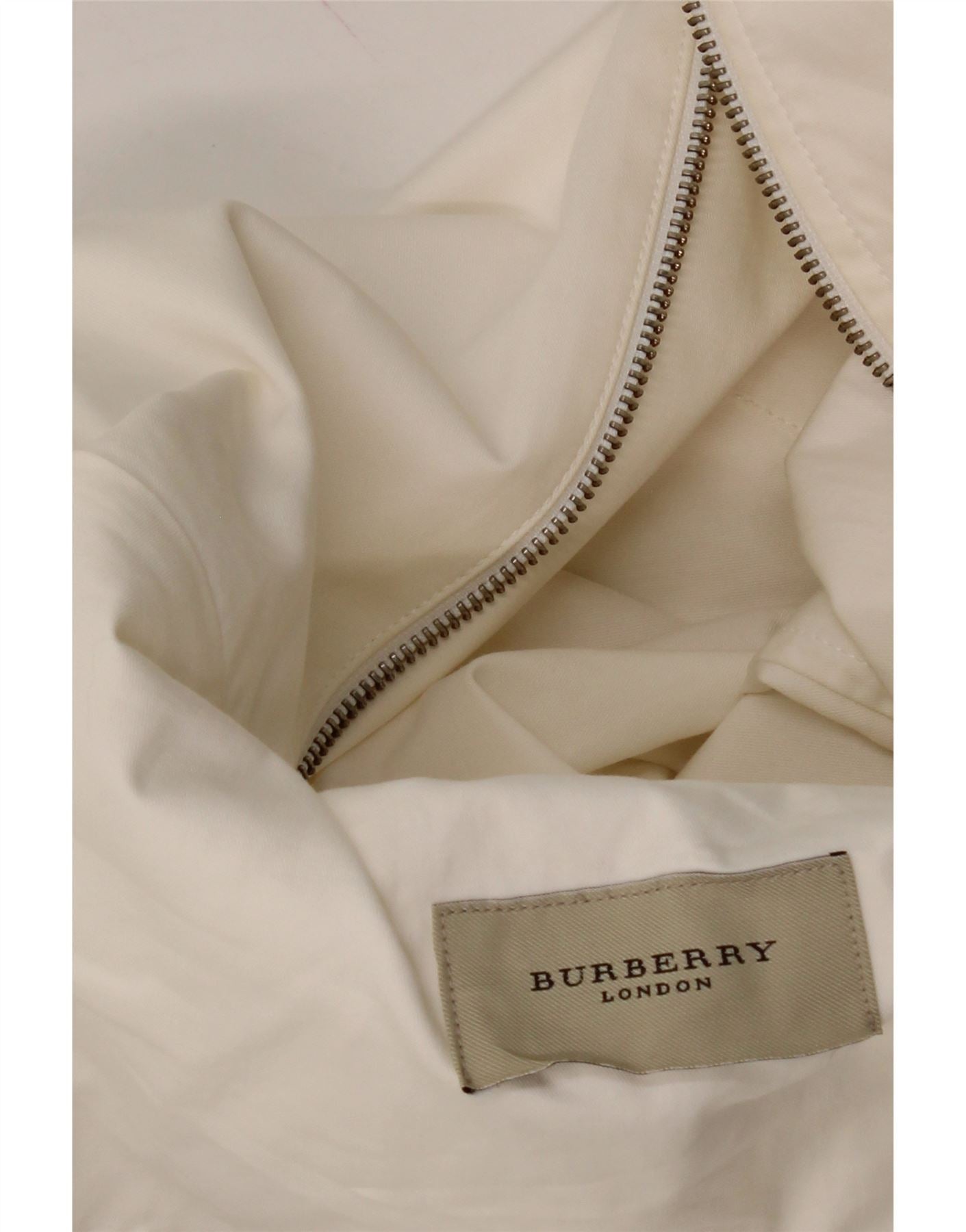 - AI Description: This pre-owned Burberry set exudes classic style. Crafted in a white woven fabric, the regular fit two-piece features a collared, long-sleeve jacket with button closure, shoulder pads, and a full lining. Accented with buttons and subtle logo detailing, the jacket includes pockets for practicality. The set, labelled size 40, shows minor stains on the sleeve, but is otherwise in excellent condition. Perfect for a refined, tailored look.