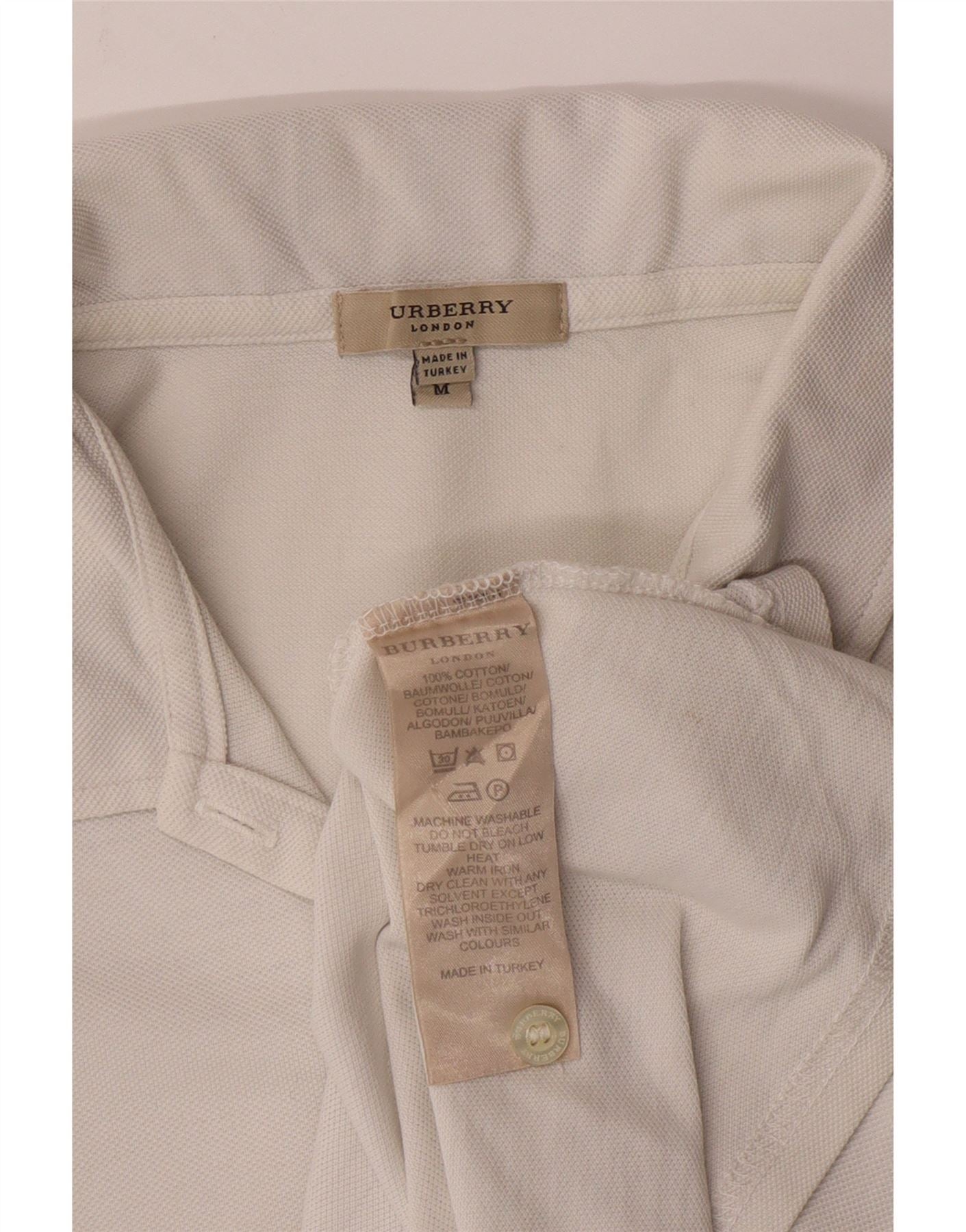 - AI Description: This Burberry women’s T-shirt top is crafted from soft off-white cotton knit. It features a classic collared neckline with a button closure, providing a refined aesthetic. Short sleeves offer a comfortable fit for everyday wear. The regular fit ensures ease of movement and a flattering silhouette. A subtle logo detail provides a signature touch, completing this versatile and timeless piece.