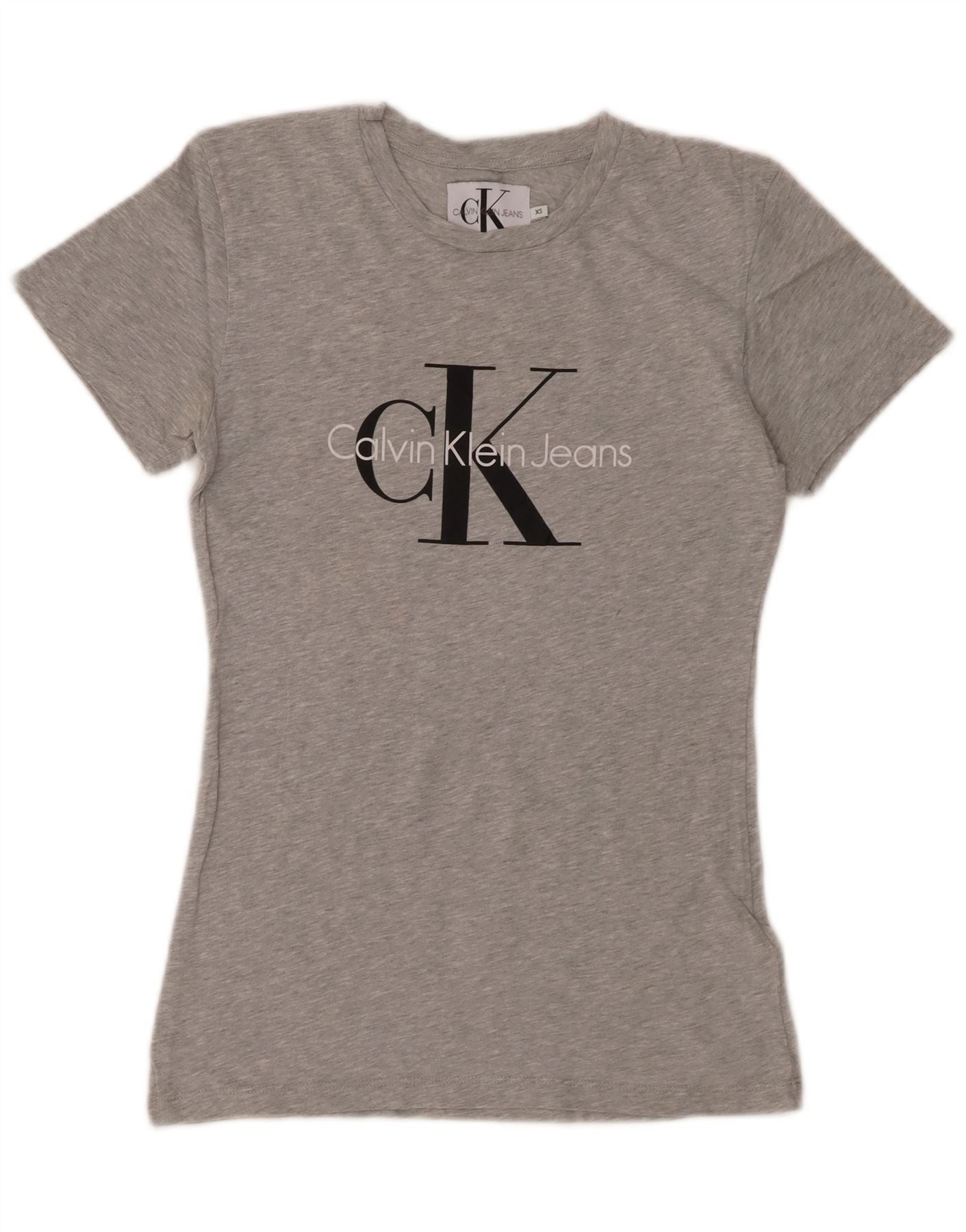 CALVIN KLEIN JEANS Grafisk T-shirt top til kvinder DK 6 XS grå flækket bomuld