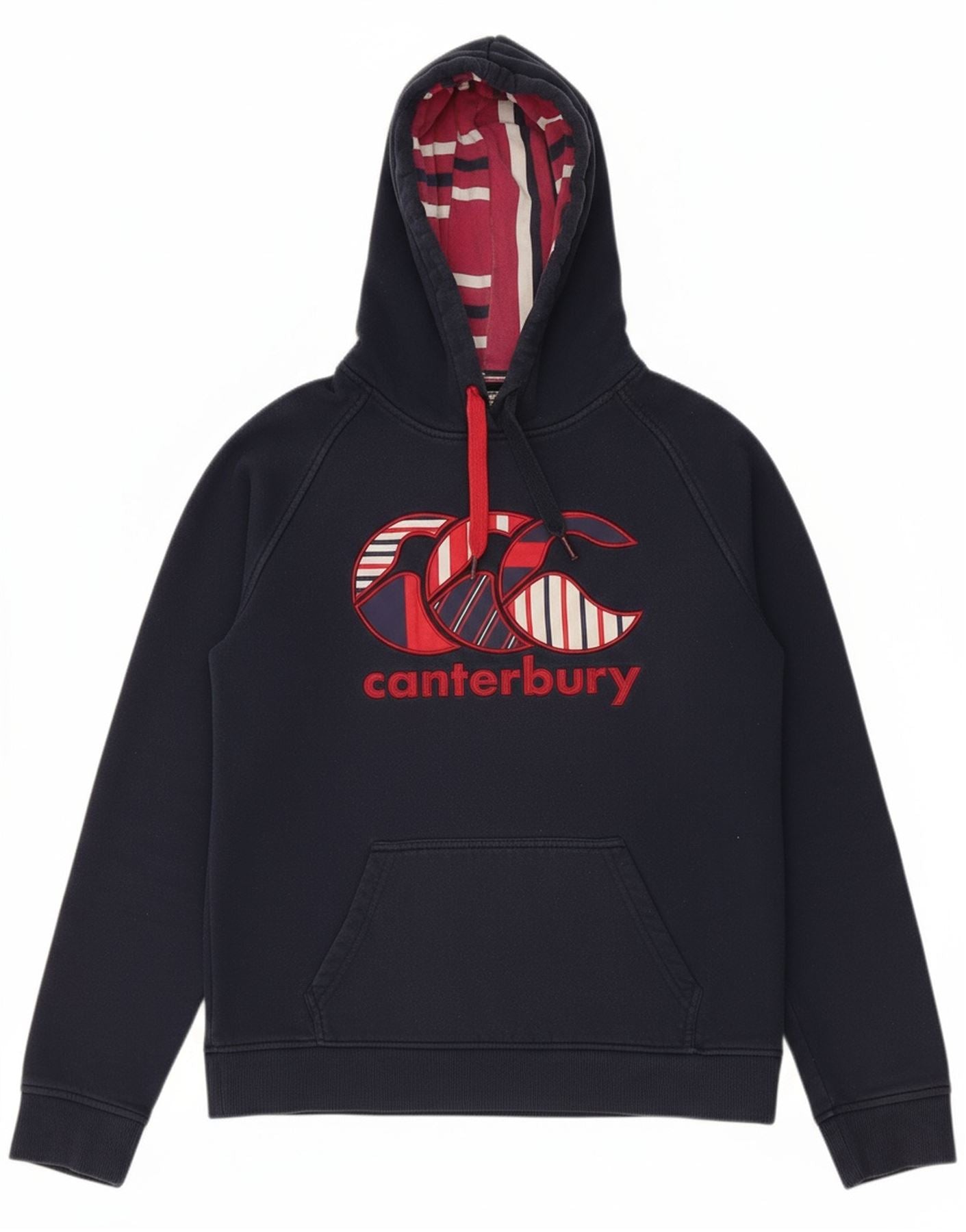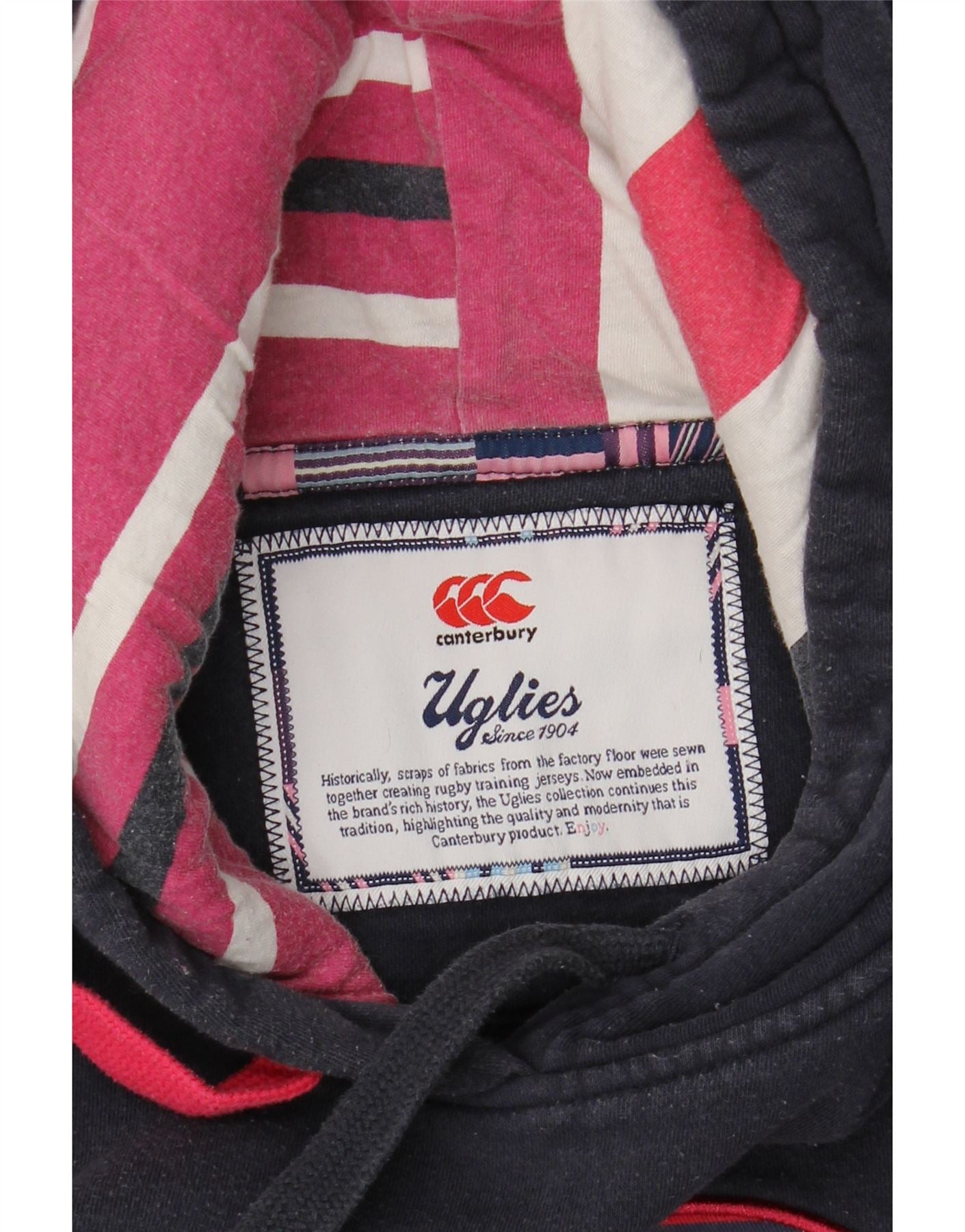 - AI Description: This Canterbury womens Hoodie Jumper is crafted from a soft navy blue knit fleece fabric. It features a comfortable regular fit and a classic pullover design. The hooded neckline offers extra warmth. Long sleeves and a round neck complete the silhouette. A striped pattern adds visual interest. The design includes practical pockets and a prominent logo accent. This Uglies model is ideal for sports, especially rugby, offering comfort and style.