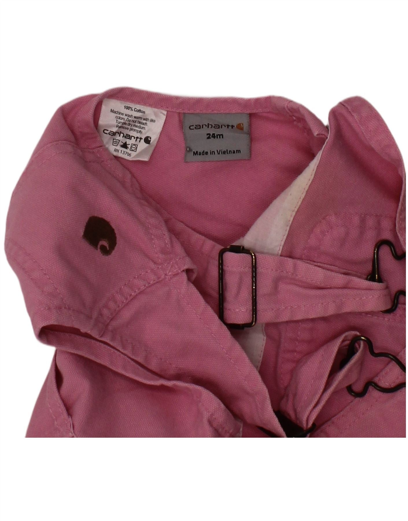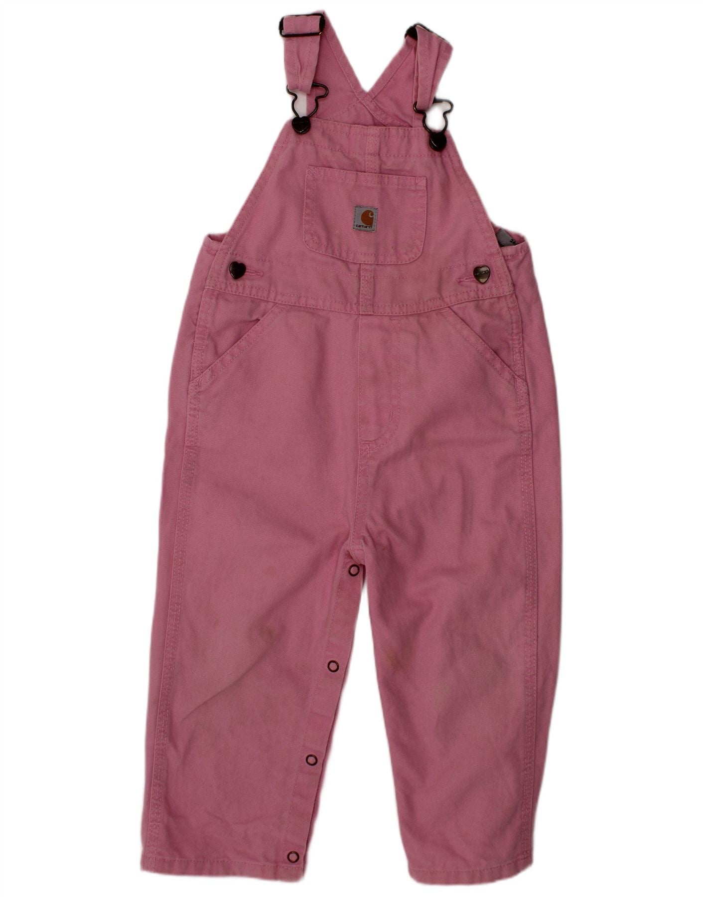 - AI Description: This Carhartt baby girls' jumpsuit is crafted from soft 100 cotton woven fabric in a charming pink hue. It features a regular fit for comfortable movement. The design includes practical pockets and adjustable buckle closures for a secure fit. Cuffed details add a neat finish. A subtle logo accent completes this durable and stylish piece.
