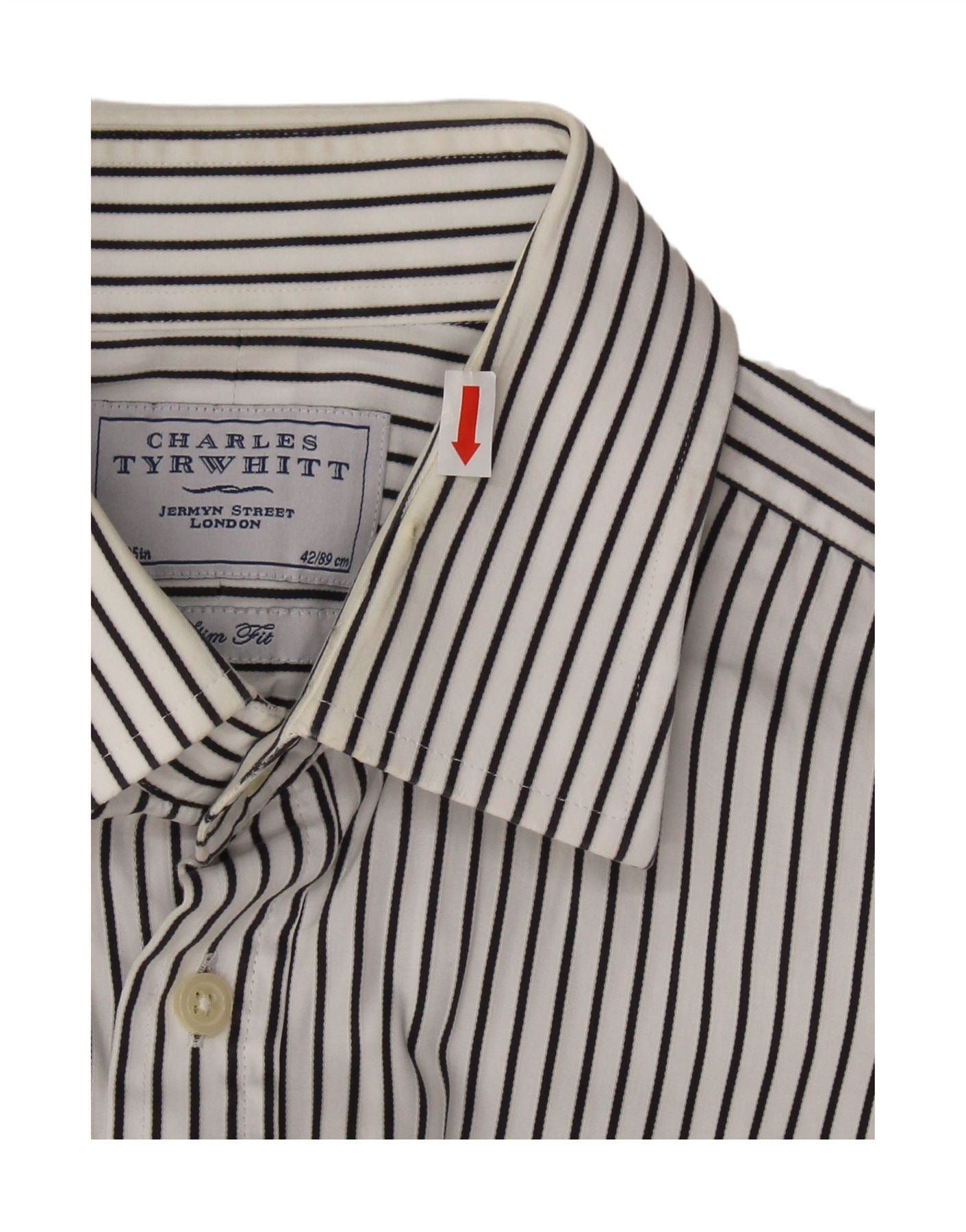 - AI Description: This Charles Tyrwhitt men's shirt features a crisp white striped woven fabric. The collared neckline and long sleeves maintain a classic aesthetic. A full button-up front provides a smart closure. Its slim fit offers a contemporary, tailored silhouette. This shirt combines timeless style with modern precision for a polished look.
