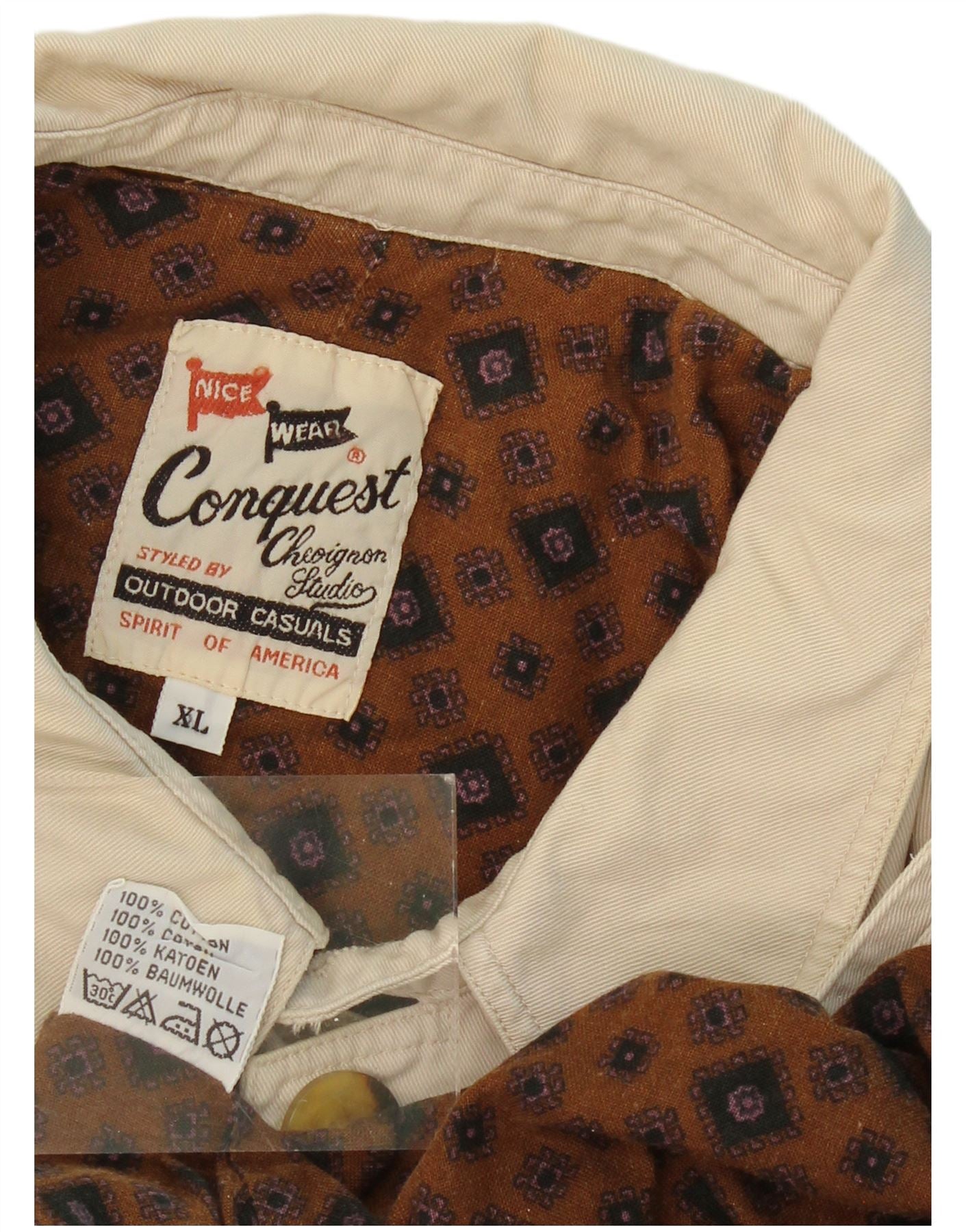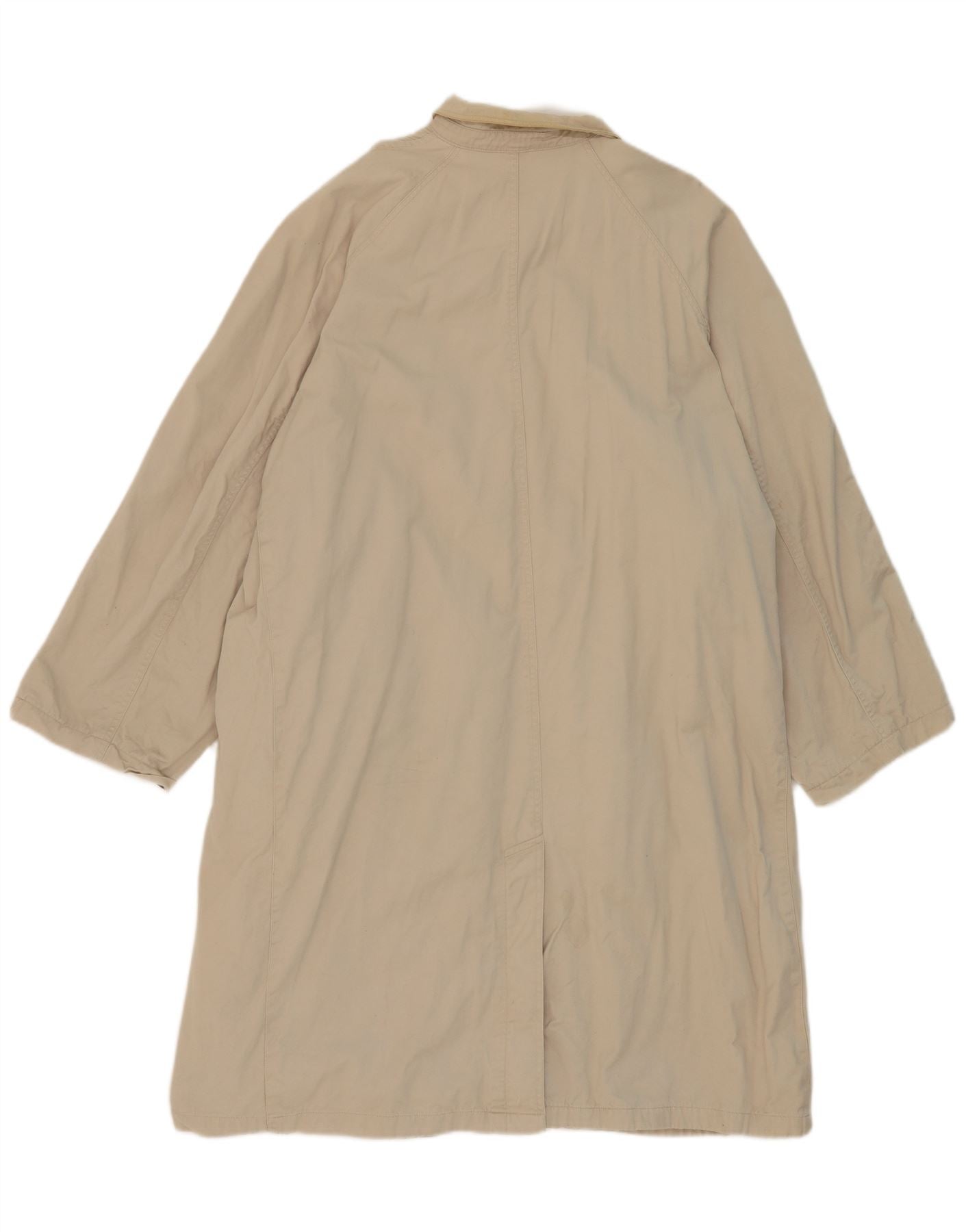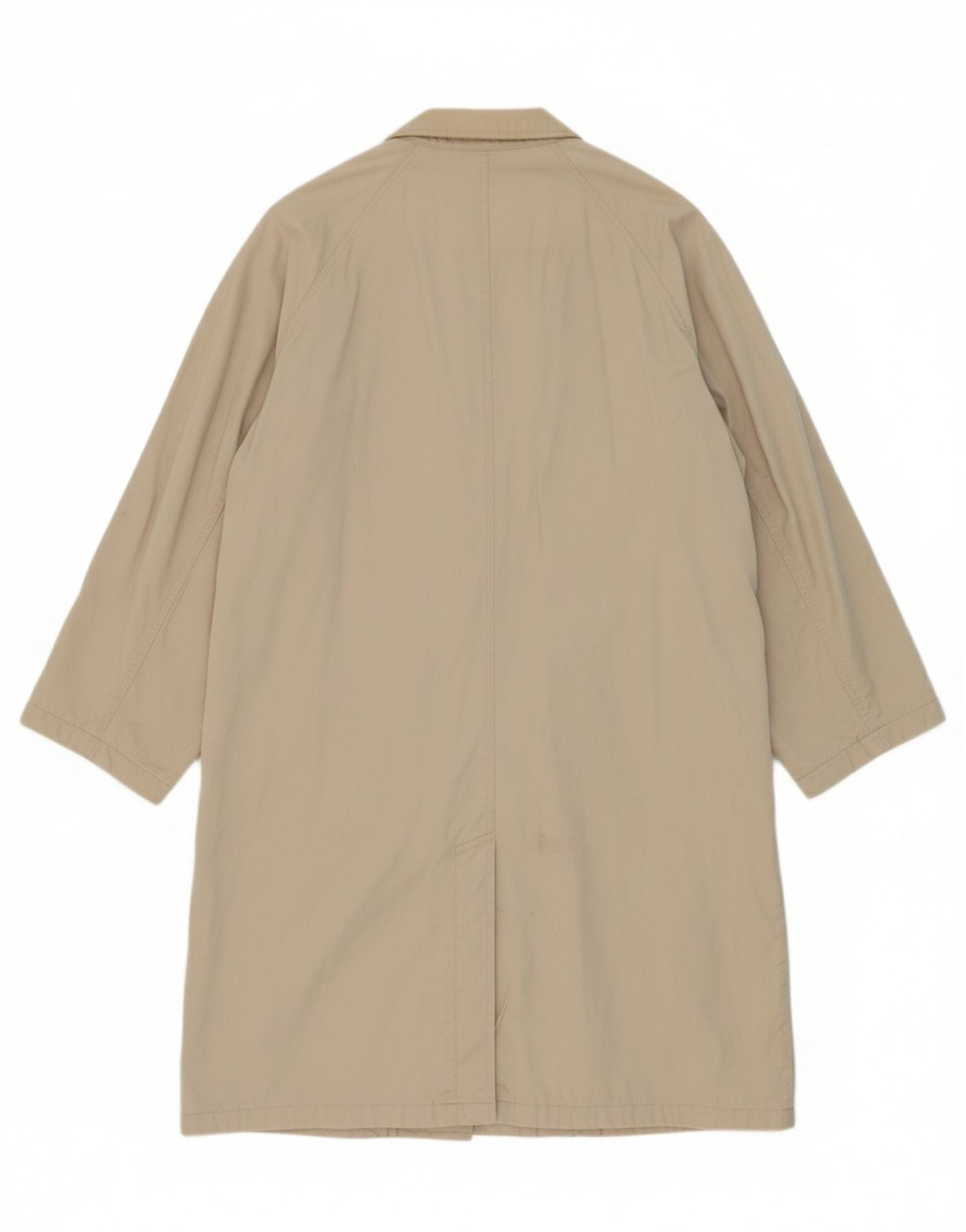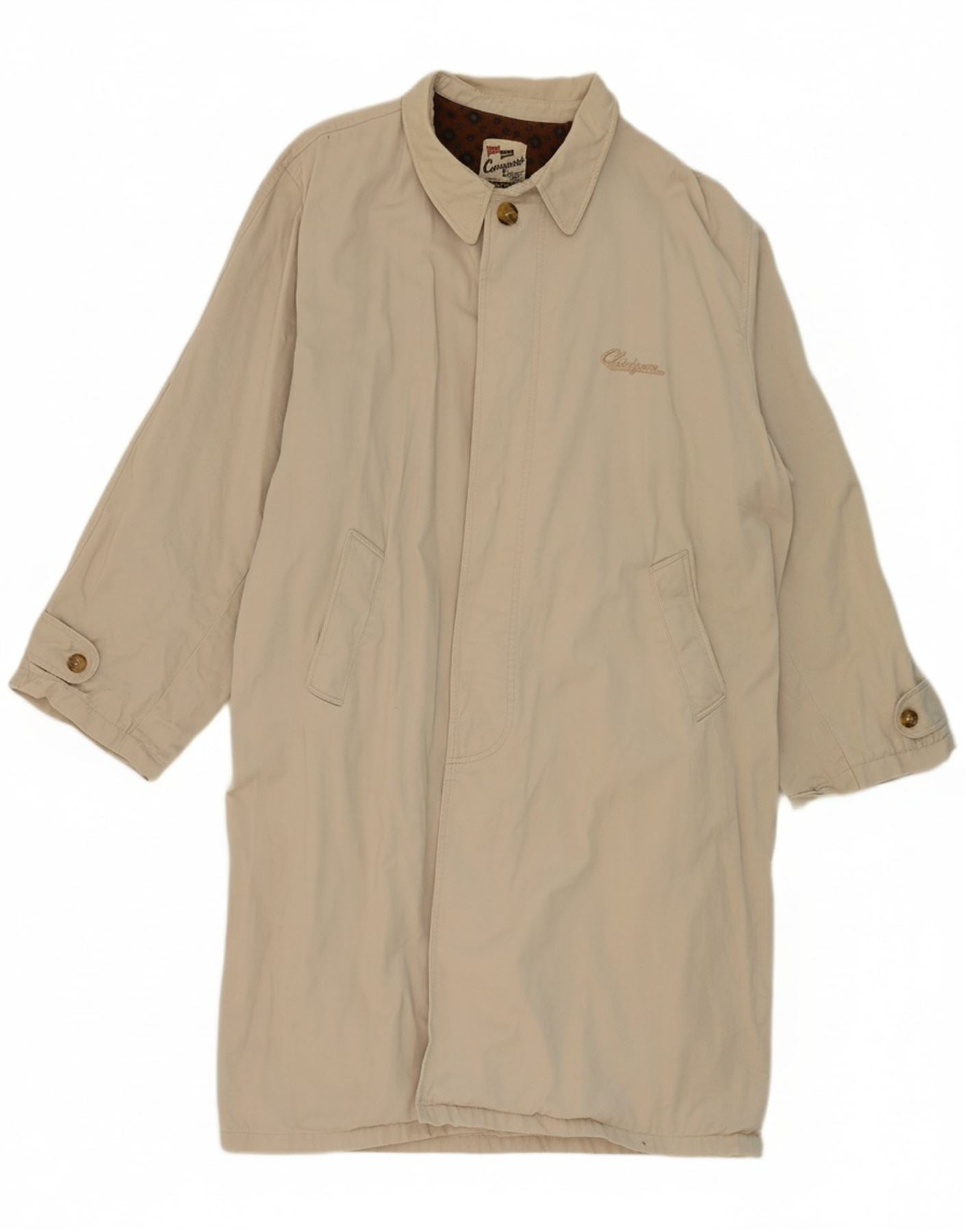 - AI Description: This Conquest mens trench coat is crafted from durable 100 percent woven cotton, presented in a classic beige hue. It features a sophisticated collared neckline and a traditional four-button front closure. Long sleeves provide ample coverage. The regular fit and lined interior ensure comfort and a smart silhouette. Practical pockets add functional detail to this timeless outerwear piece.