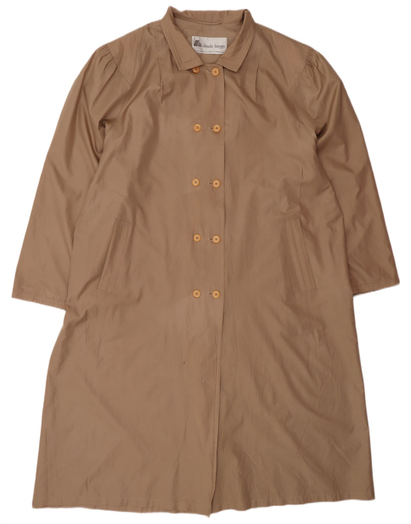 - AI beskrivelse: Denne regnfrakke fra Claude Havrey til kvinder er lavet af let beige polyestervævet stof. Den har en klassisk halsudskæring og lange ærmer. Knap-up front lukning er accentueret med tonale knapper. Denne vandtætte frakke giver en normal pasform til behageligt slid. Den indeholder praktiske lommer, der blander funktionalitet med en tidløs stil.