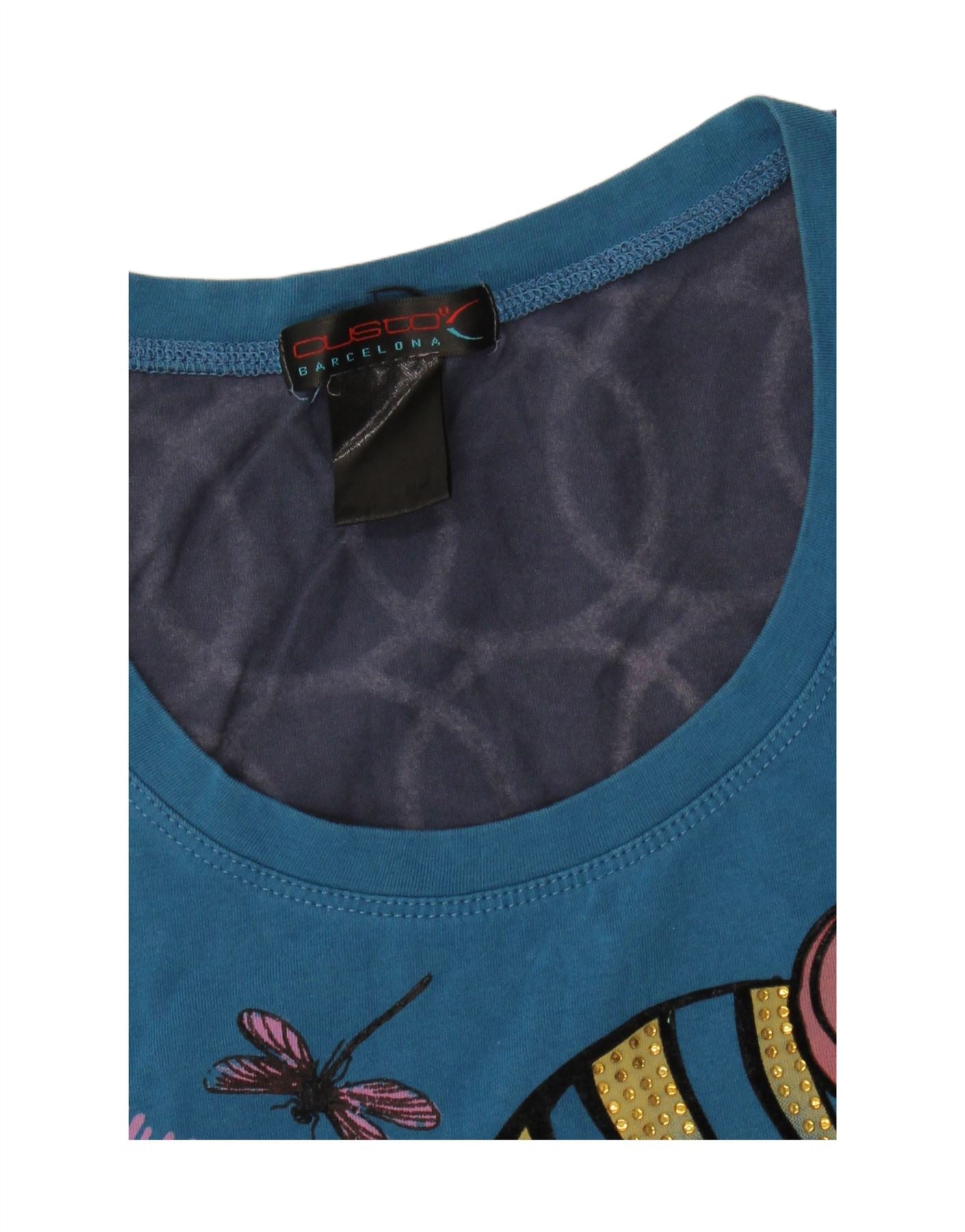 - AI Description: This Custo Barcelona women’s graphic T-shirt top is crafted from soft blue jersey. It features a classic round neck and short sleeves. The regular fit offers comfortable wear. A striking illustration print adorns the front, enhanced by subtle sequin accents. This piece perfectly blends artistic flair with everyday style for a unique look.