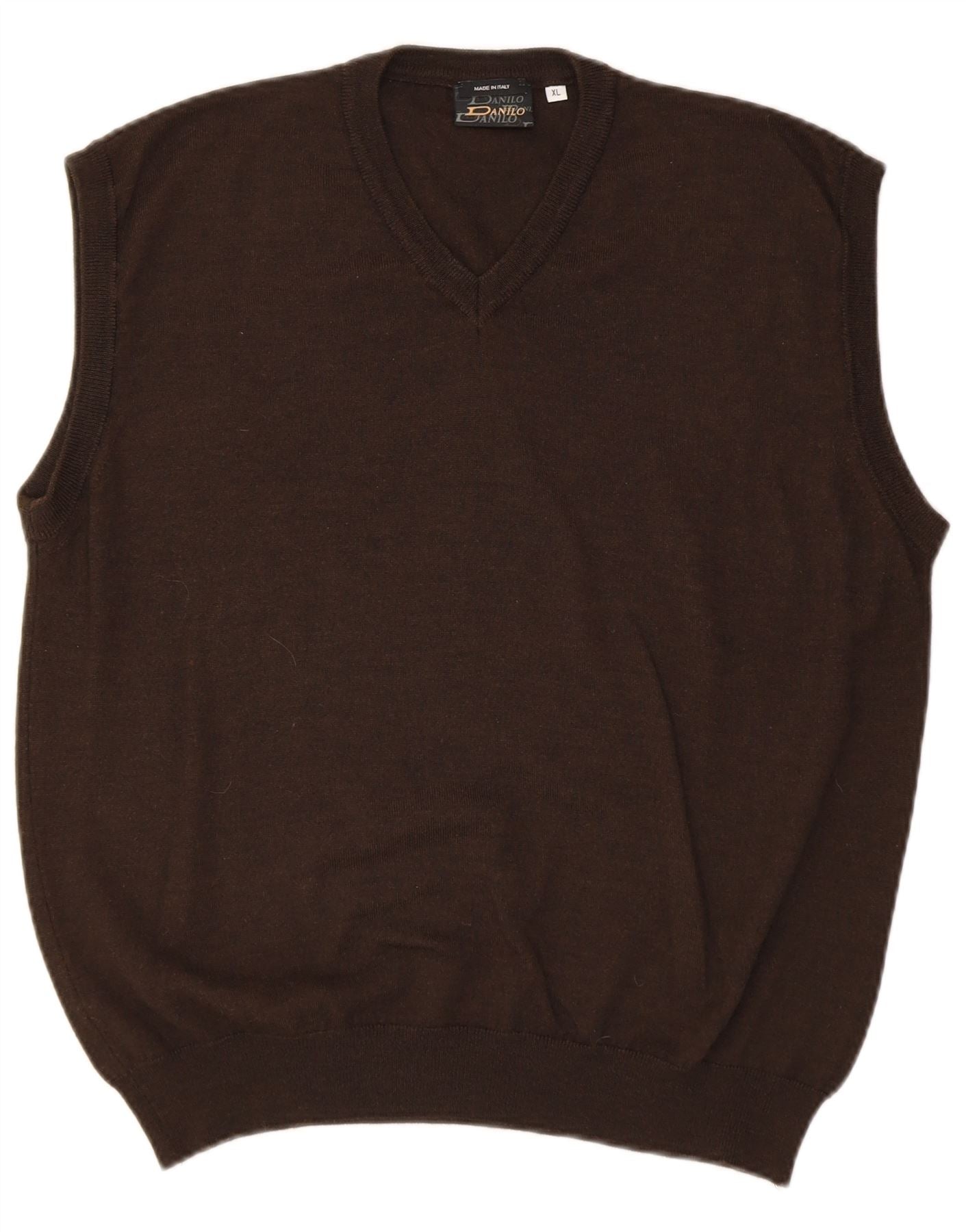 - AI Description: This Danilo mens brown V-neck vest is crafted from a soft wool and acrylic blend, offering a comfortable knit texture. The sleeveless design and classic V-neckline provide a clean, versatile silhouette. Its regular fit ensures ease of wear. This pullover style is perfect for layering or standalone wear, making it a timeless addition to any wardrobe. The blended fabric offers warmth without bulk.