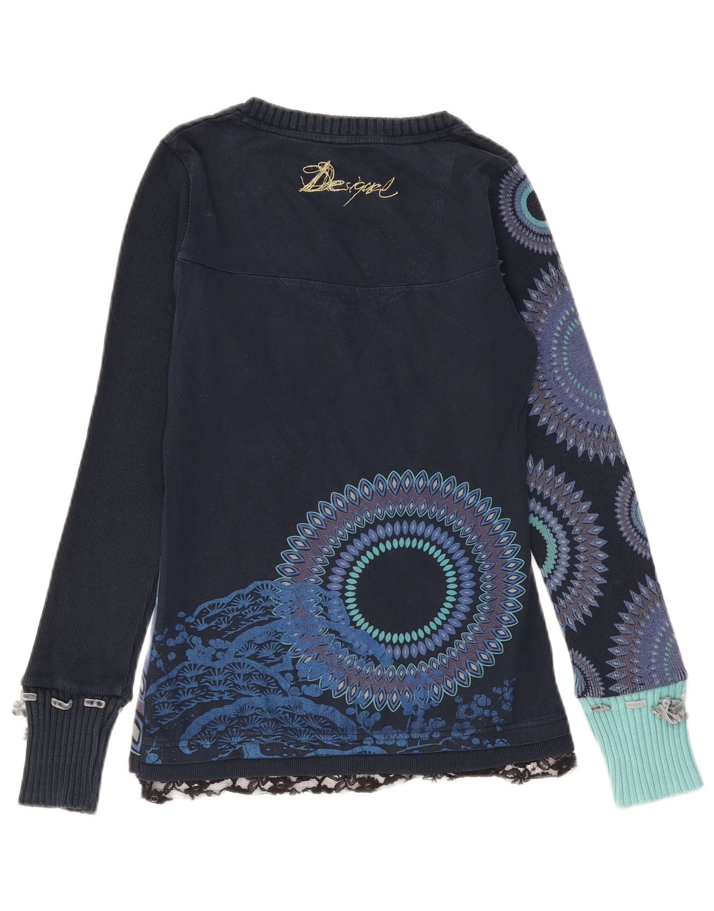 DESIGUAL Dame grafisk V-hals sweater UK 8 Small Navy Blue Floral