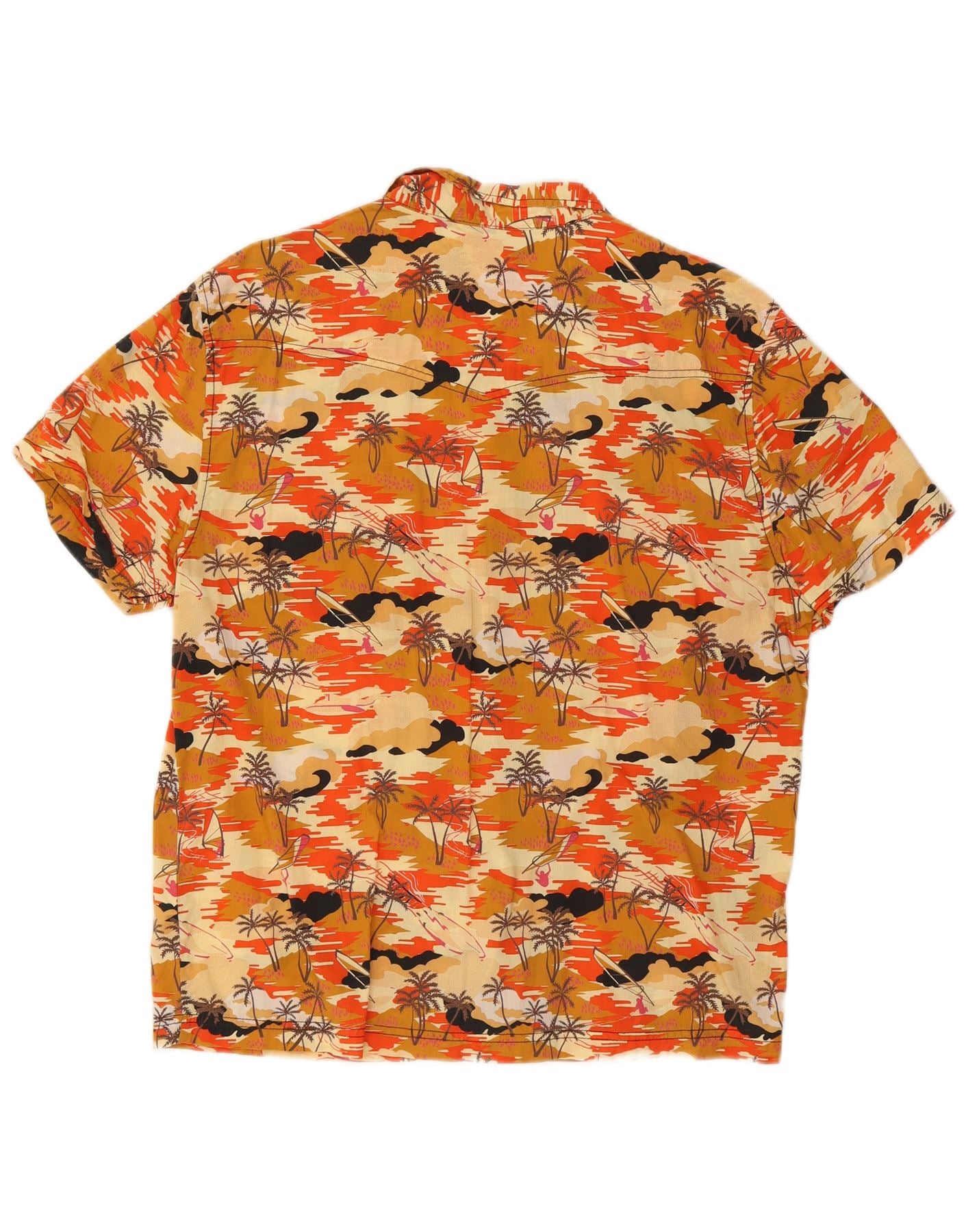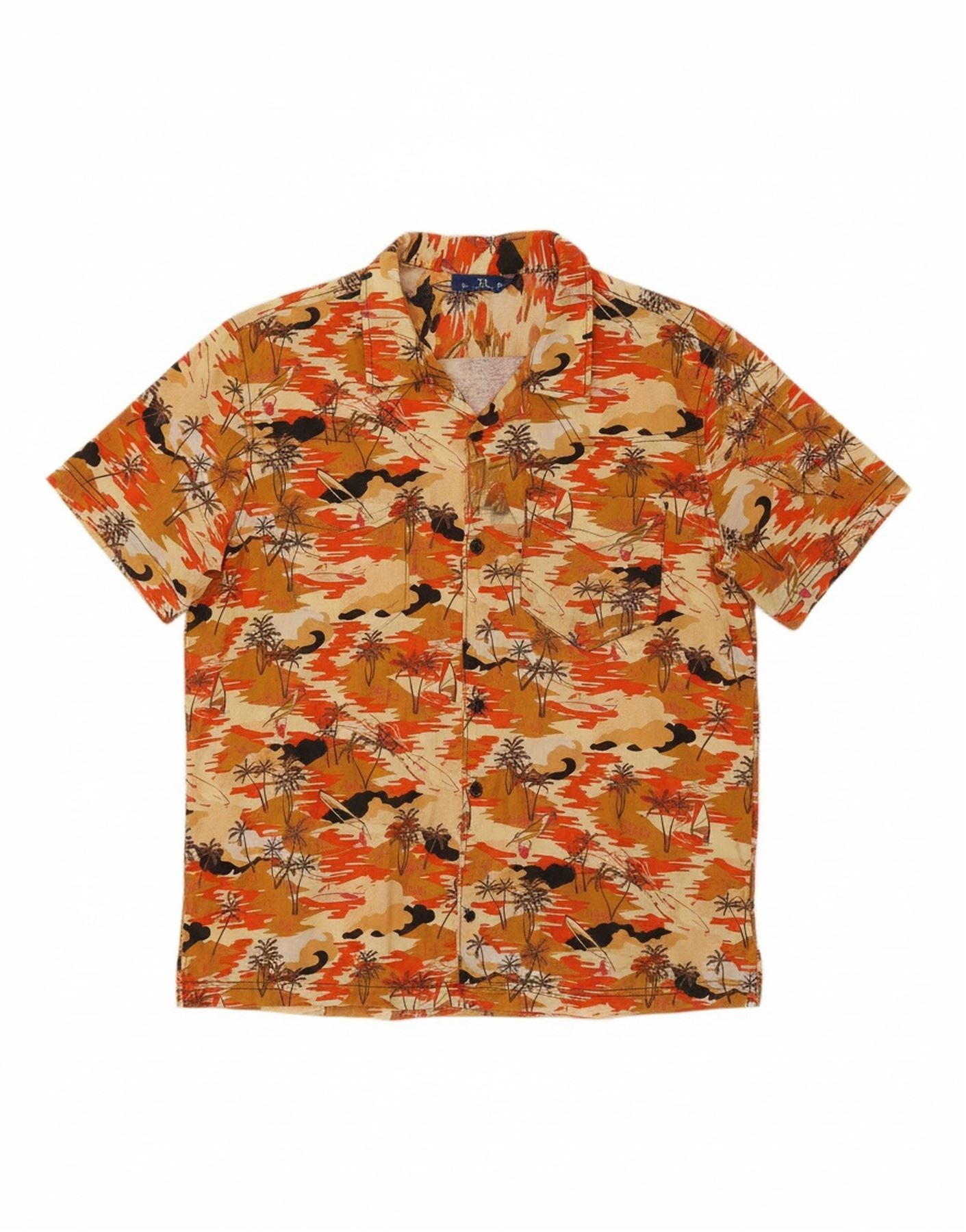 - AI Description: This Divided men's Hawaiian shirt features a vibrant orange floral pattern woven into the fabric. The collared neckline and button-up closure give it a classic, casual style. Short sleeves and a regular fit offer comfort and ease of movement. The woven fabric provides a lightweight feel, perfect for warm weather. Its collared feature adds a touch of refinement to the relaxed silhouette.