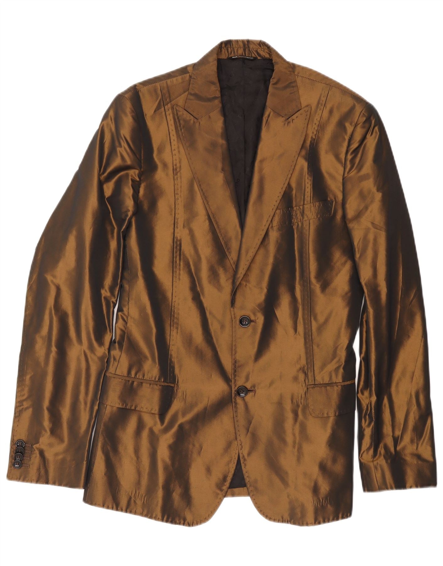 - AI beskrivelse: Denne Dolce Gabbana herre 2-delt jakkesæt er lavet af en luksuriøs brun satinblanding, der giver en karakteristisk glans. Den har en halsudskæring og lange ærmer. Den almindelige pasform sikrer en behagelig silhuet. En frontlukning med to knapper og knapper på manchetterne tilføjer klassisk skræddersyning. Den har praktiske lommer og er fuldt foret for komfort.