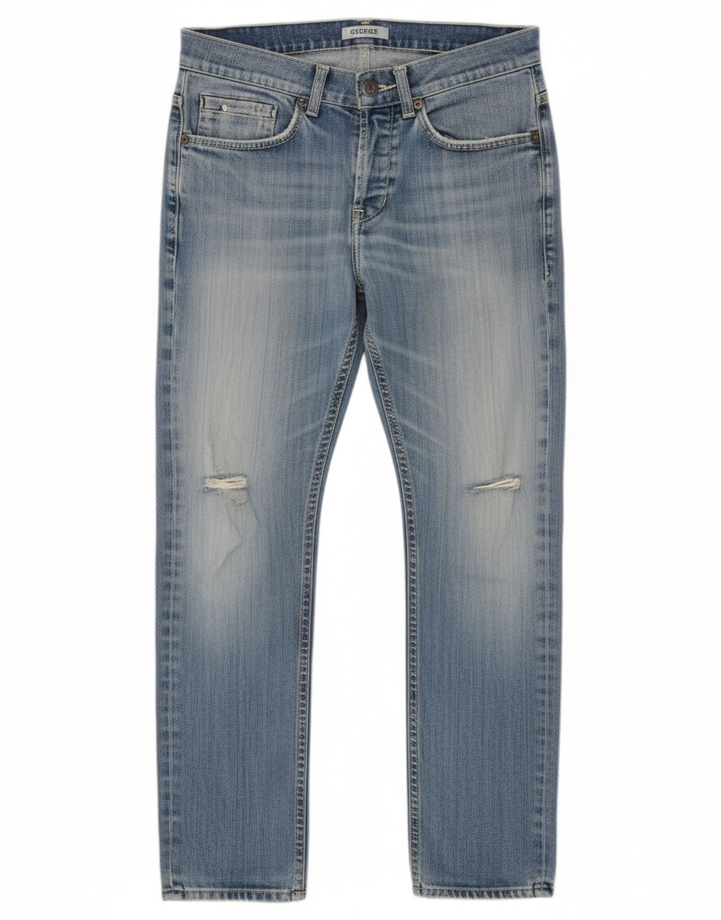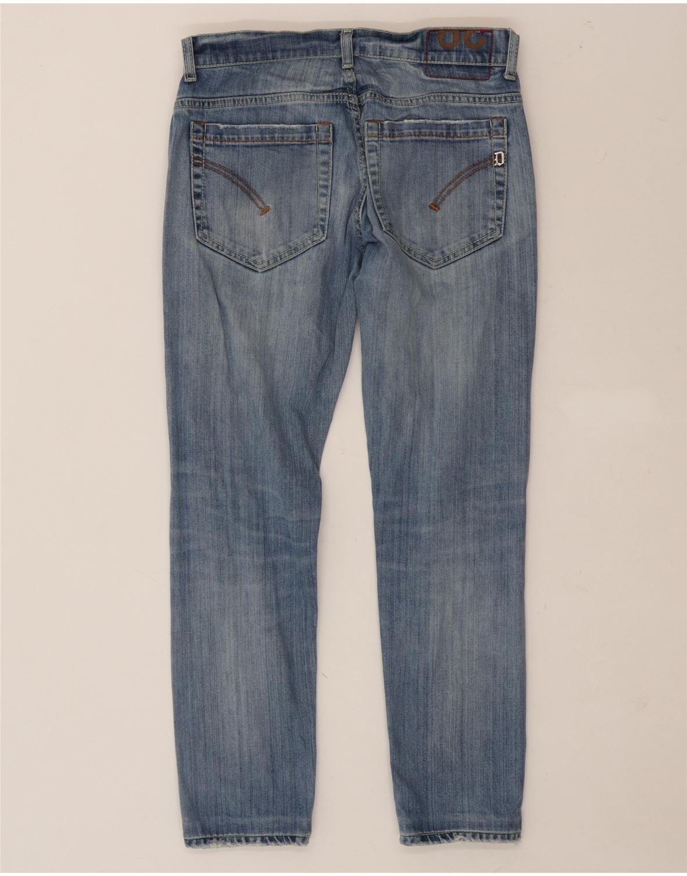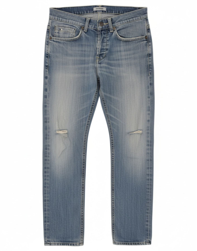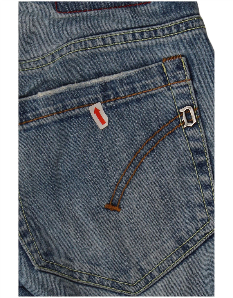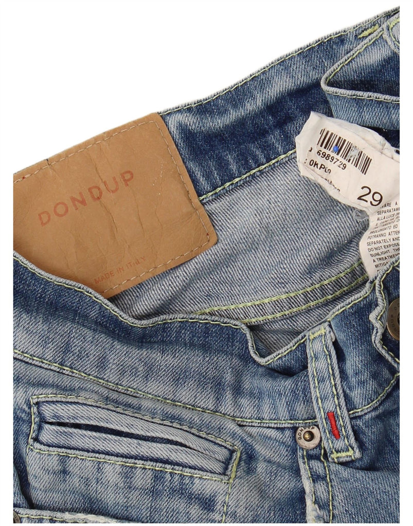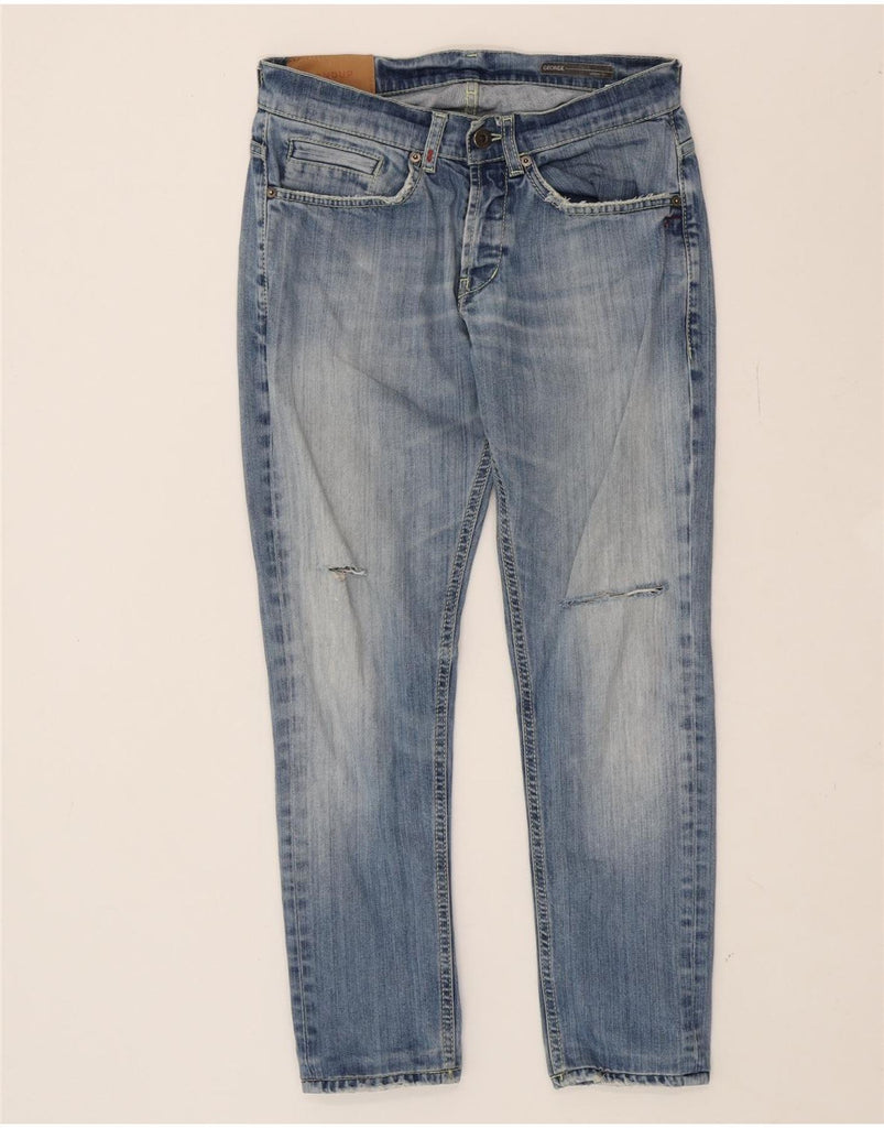 - AI Description: This Dondup mens straight jeans are crafted from robust blue denim. The denim features a distressed finish, offering a contemporary, lived-in texture. Designed with a regular fit, these jeans ensure comfortable wear. A button closure secures the waist, and practical pockets provide functionality. A subtle logo accent adds a signature, modern touch to the design.