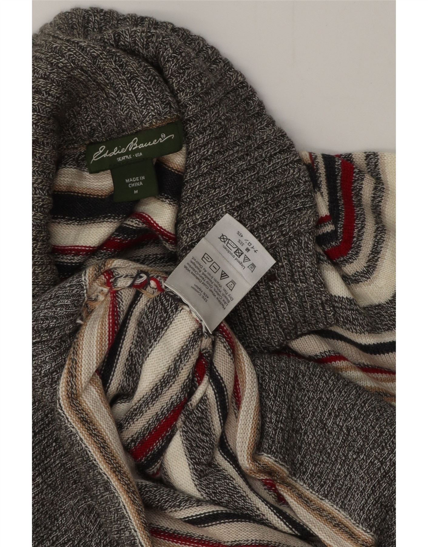 - AI beskrivelse: Denne Eddie Bauer sweater med knaphals til kvinder er lavet af blød 100 procent bomuldsstrik. Den har et klassisk stribet mønster i flerfarvede toner af grå, hvid og rød. Det falske halsdesign inkluderer en knaplukning til justerbar styling. Lange ærmer afsluttes med behagelige manchetter. Dens regulære pasform giver en tidløs og behagelig silhuet.