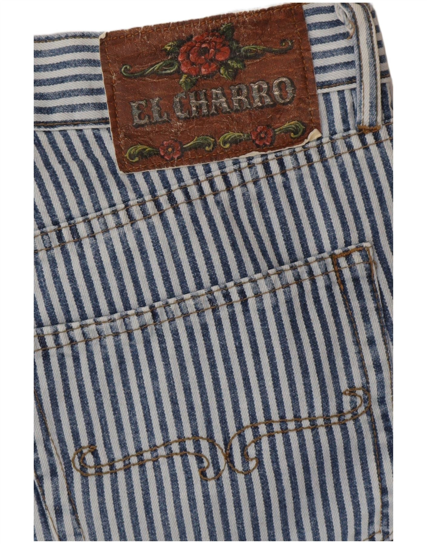 - AI beskrivelse: Disse cropped jeans til kvinder fra El Charro er lavet af blå- og hvidstribet denim. De har en mellemhøj talje og en knaplukning. Den afslappede pasform giver behageligt slid. Klassiske lommer medfølger, og et mærkelogomærke pryder den bagerste linning. Den beskårede længde giver en retrostil.