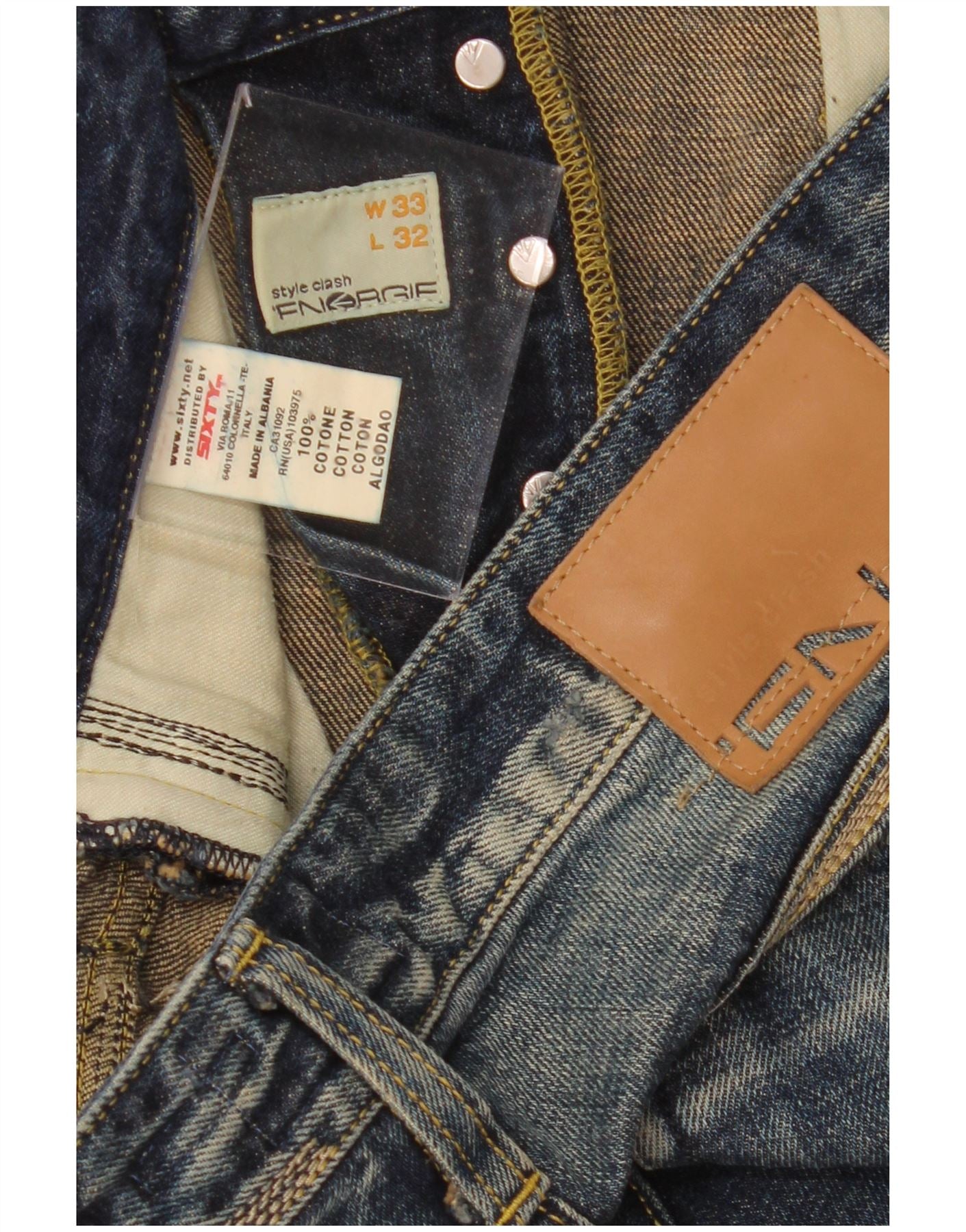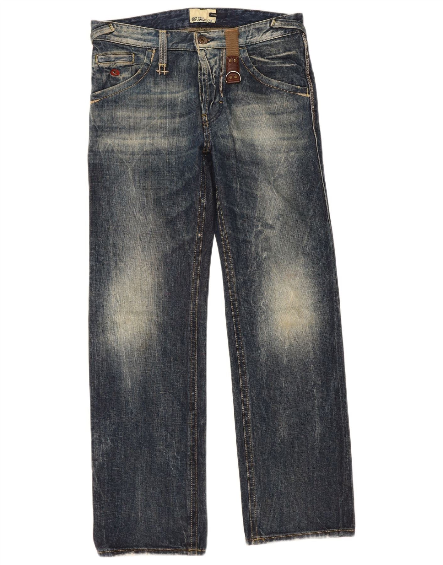 - AI Description: These Energie mens straight jeans are crafted from 100 percent cotton denim. The blue wash features a distressed finish for a worn-in look. They offer a regular fit with a classic straight leg. A button closure secures the waist, complemented by practical pockets. Subtle studded accents add a touch of detail. This Clash model embodies a timeless, classic style.