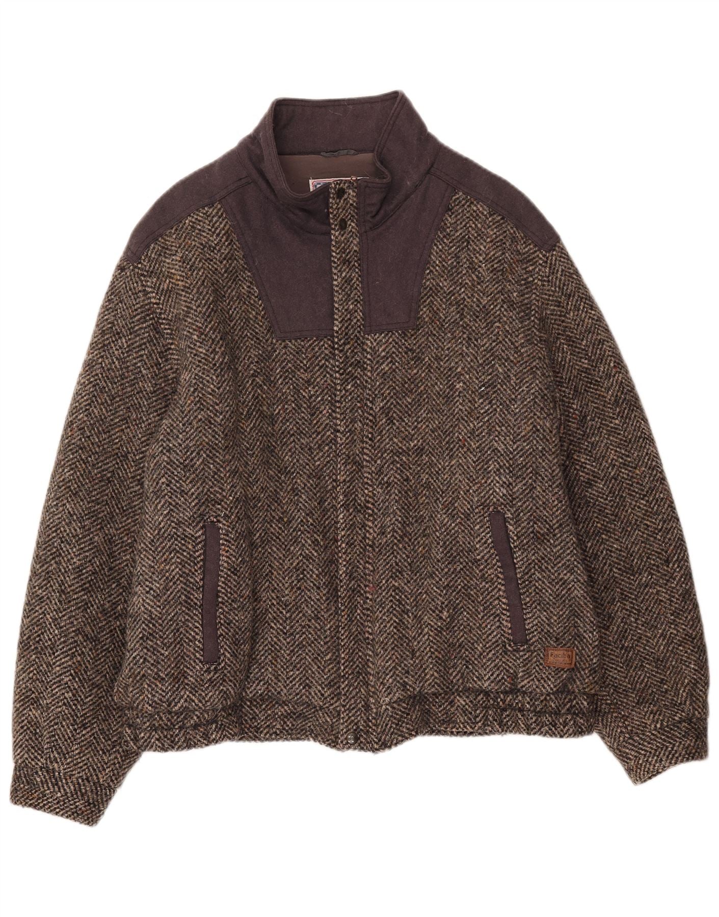 - AI beskrivelse: Denne Faciba herrejakke er lavet af et rigt brunt tweedstof med et klassisk sildebensmønster. Den har en halsudskæring og fuld lynlås for en smart finish. Lange ærmer og en normal pasform sikrer behageligt slid. Jakken er helforet og har praktiske lommer. Et subtilt mærkelogo tilføjer en raffineret detalje.