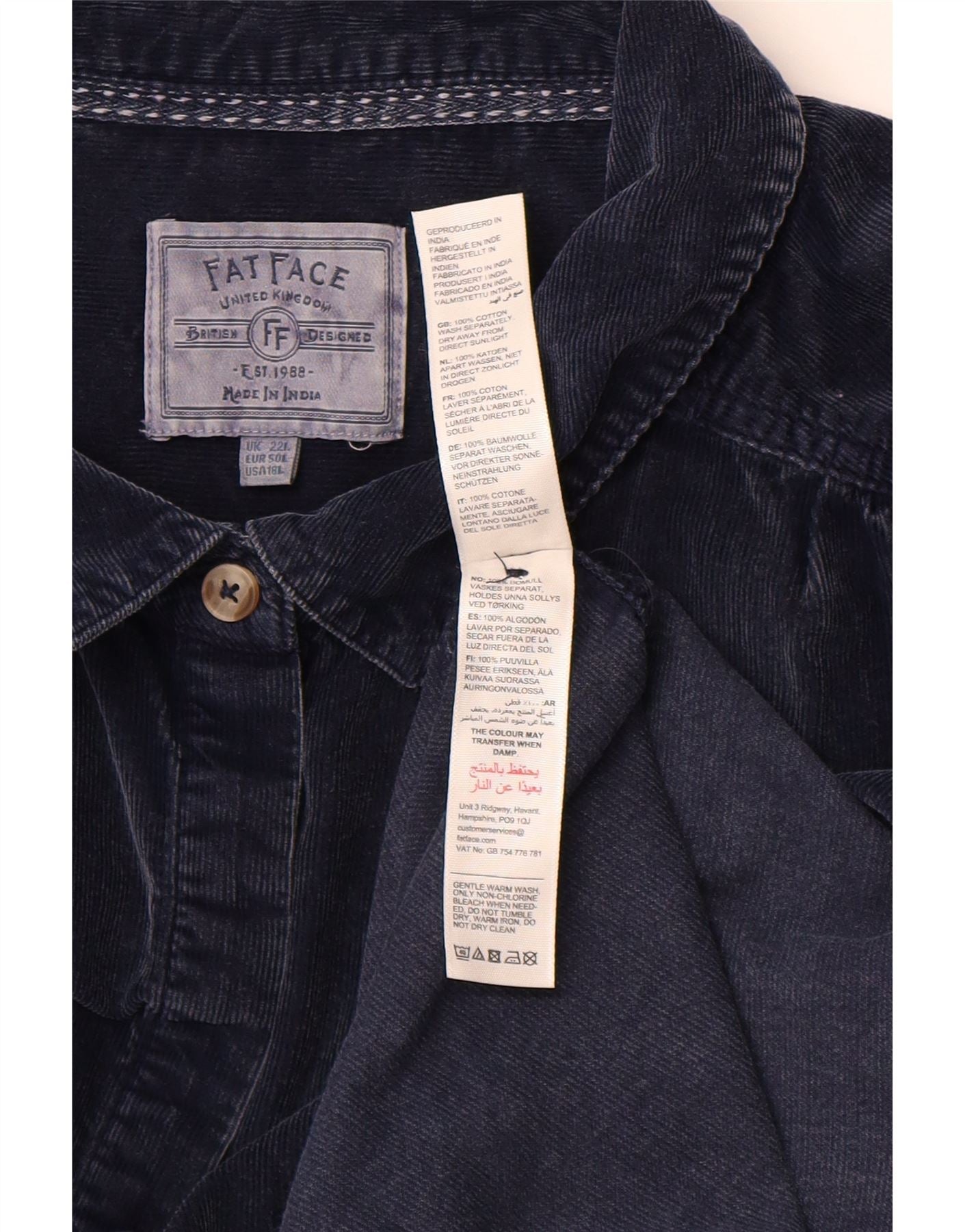 - AI Description: This Fat Face womens Tunic Top is crafted from soft navy blue corduroy, made from 100 cotton. It features a classic collared neckline and long sleeves. The relaxed fit ensures comfortable wear. A full button-up front adds traditional detail. Practical pockets complete the design. This piece offers a timeless, versatile aesthetic.