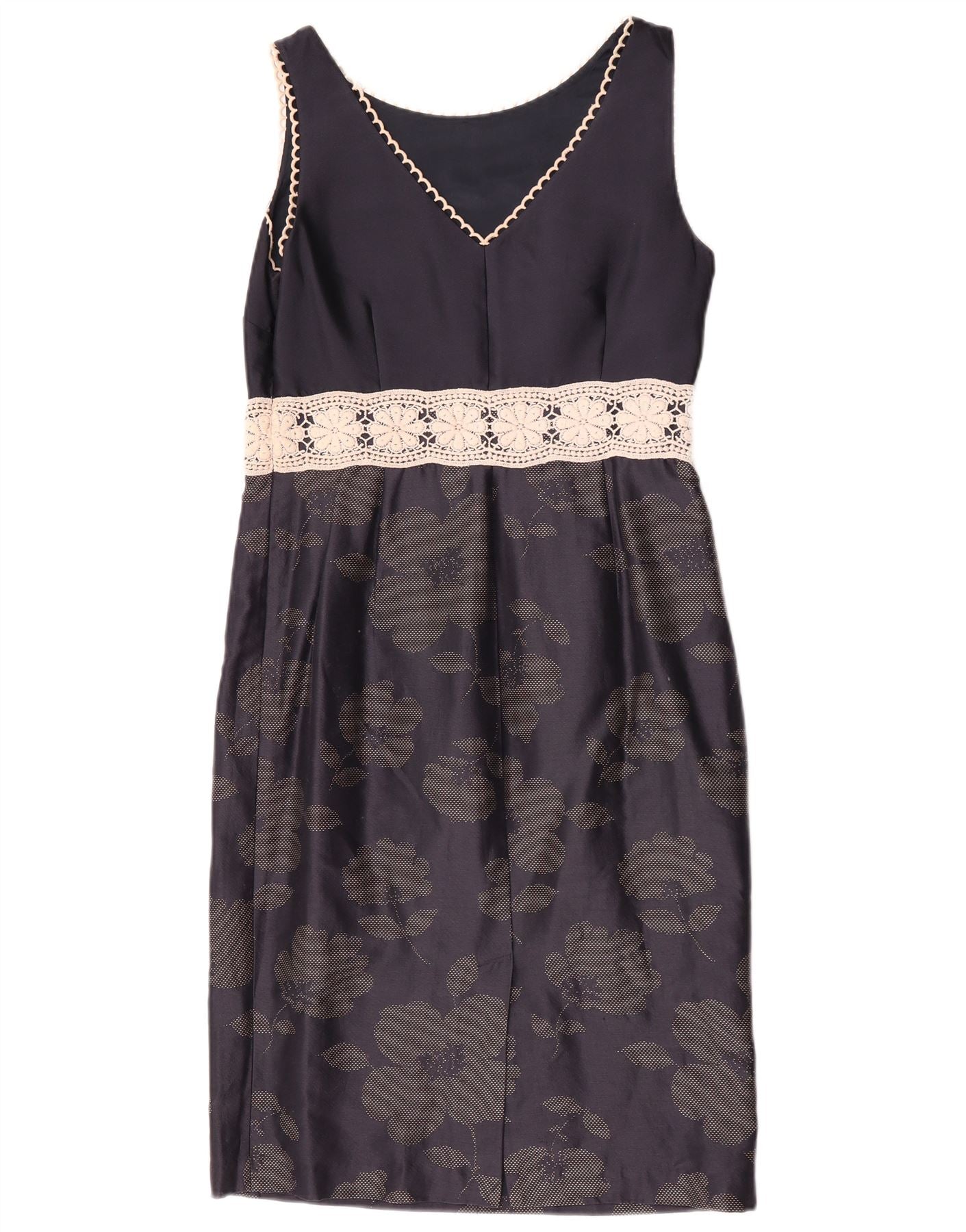 - AI beskrivelse: Denne Fenn Wright Manson kvindeskedekjole er lavet af et luksuriøst marineblåt bomuldsblandingsstof med en subtil glans. Den har en klassisk V-udskæring og et ærmeløst design. En delikat blondekant fremhæver halsudskæringen og definerer taljen. Nederdelafsnittet viser et tonalt blomstermønster, vævet ind i stoffet for diskret elegance. Den klassiske pasform og lynlås sikrer en slank silhuet.
