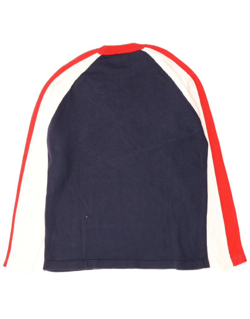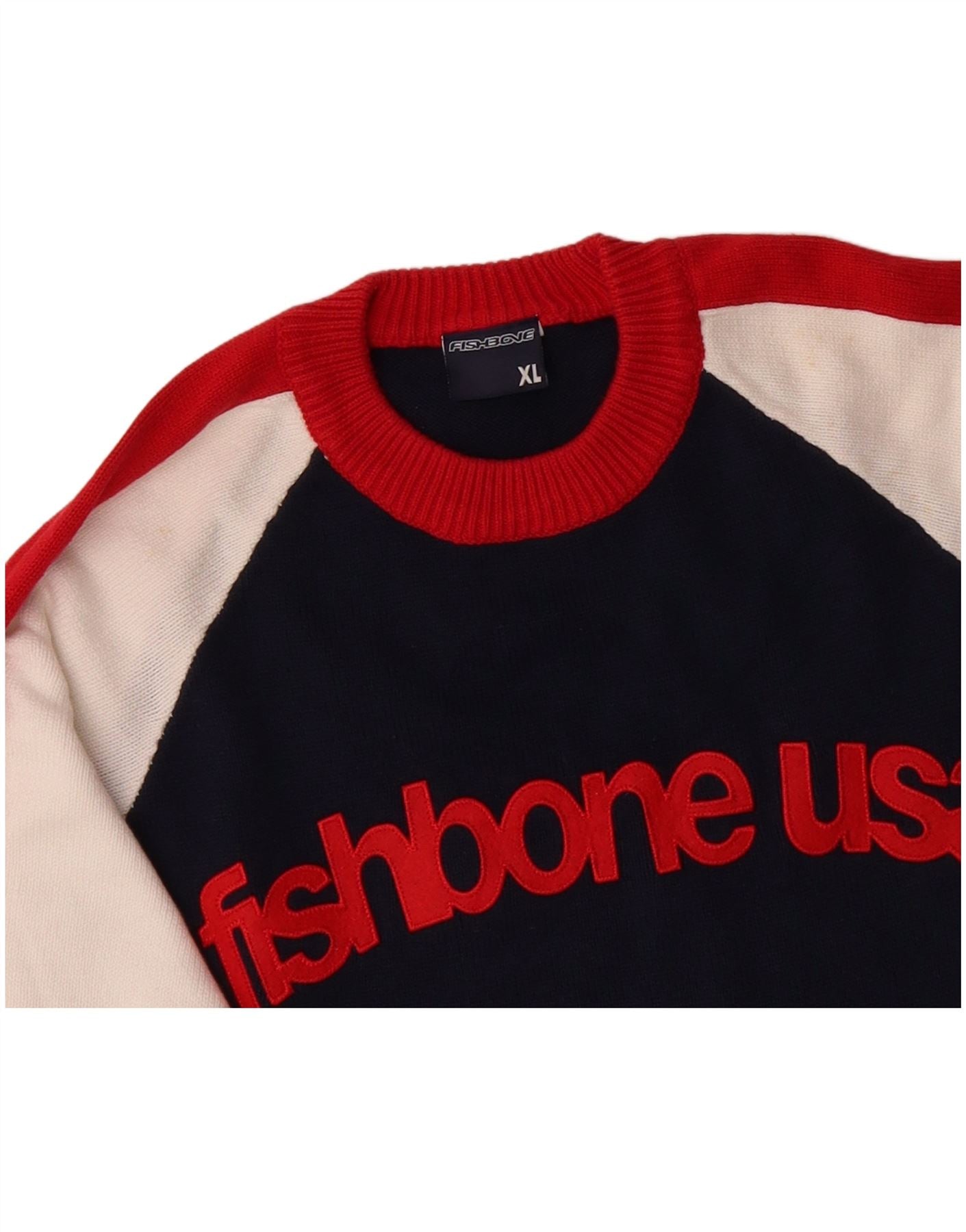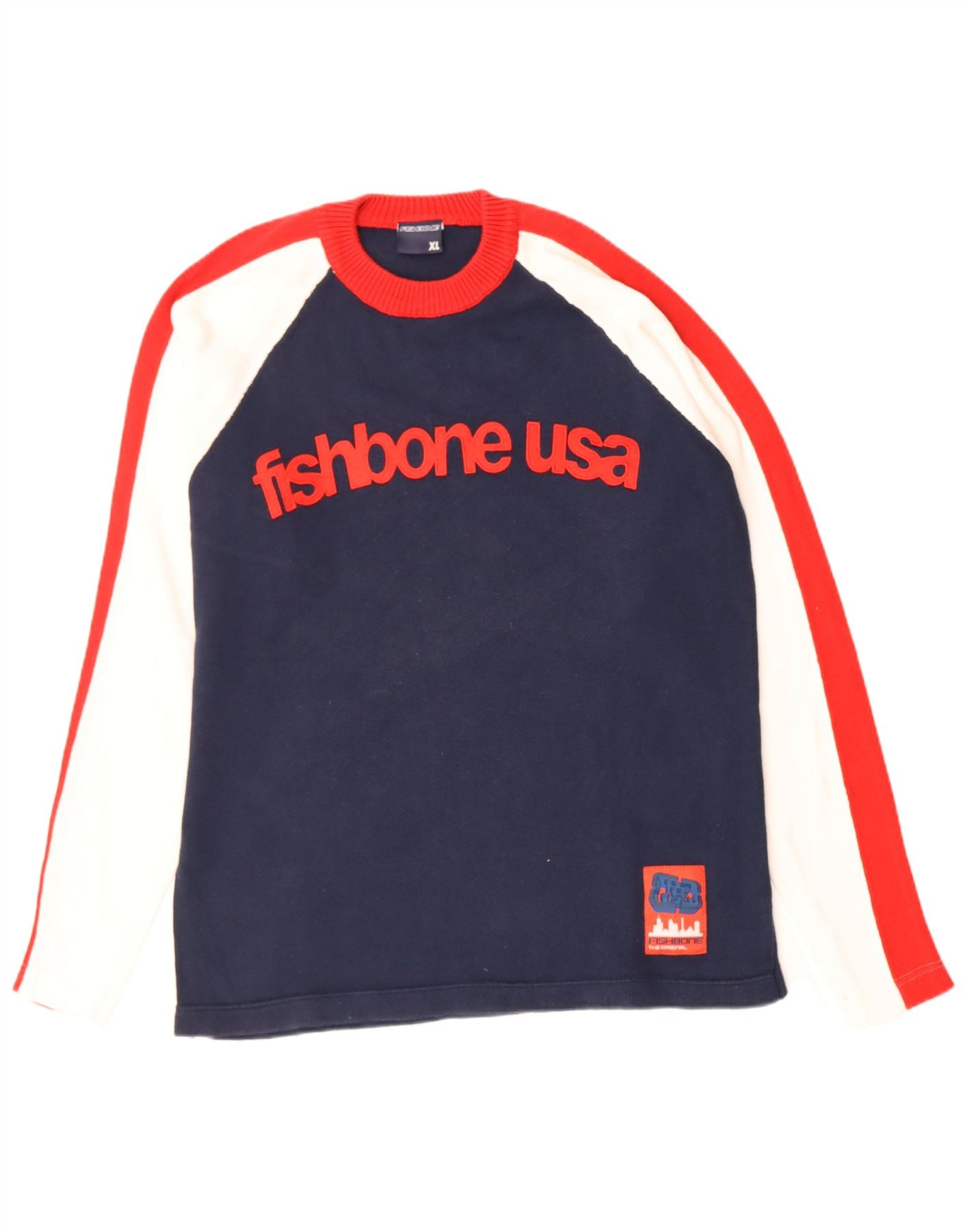 FISHBONE Mens Graphic Crew Neck Jumper Sweater XL Navy Blue Colourblock