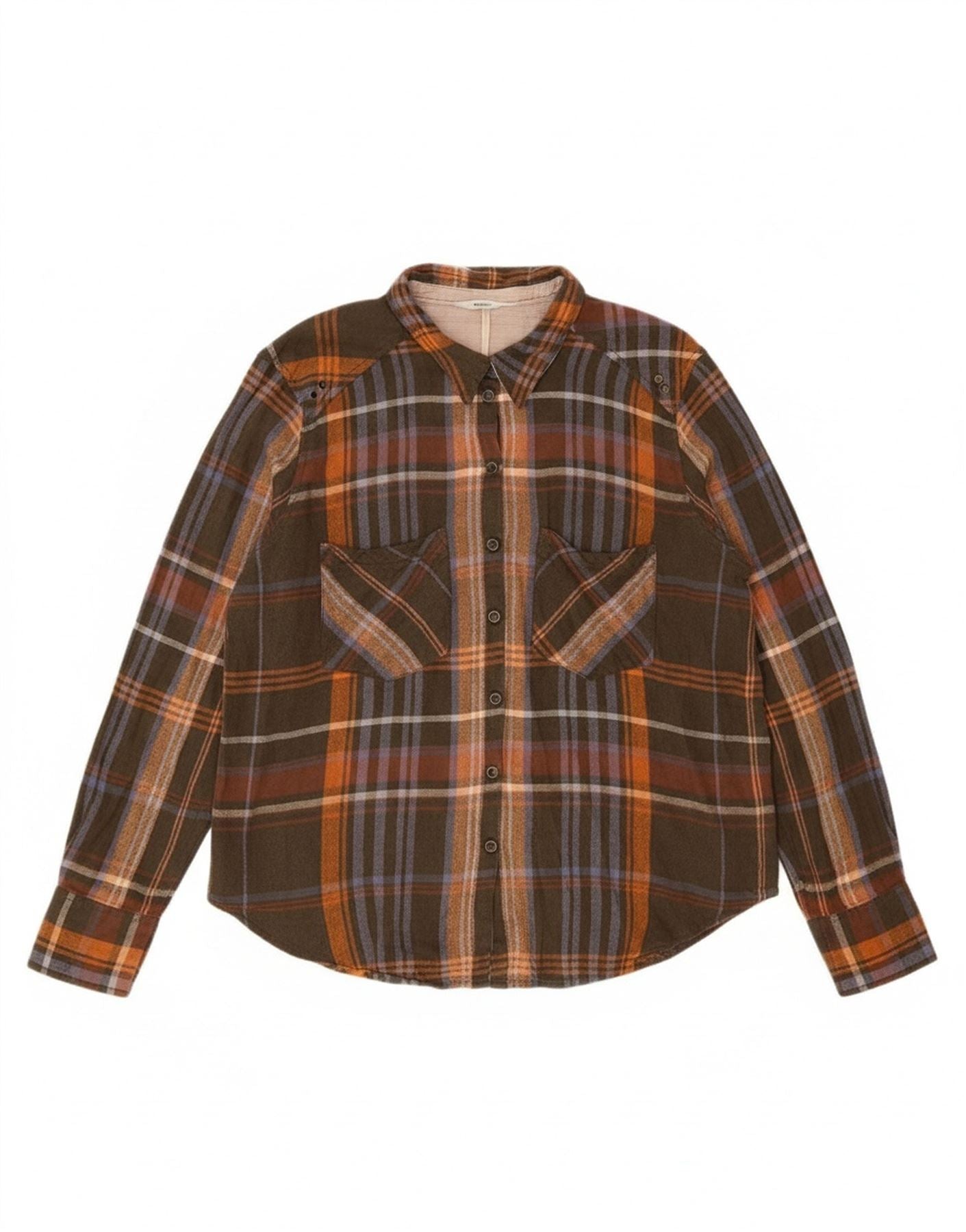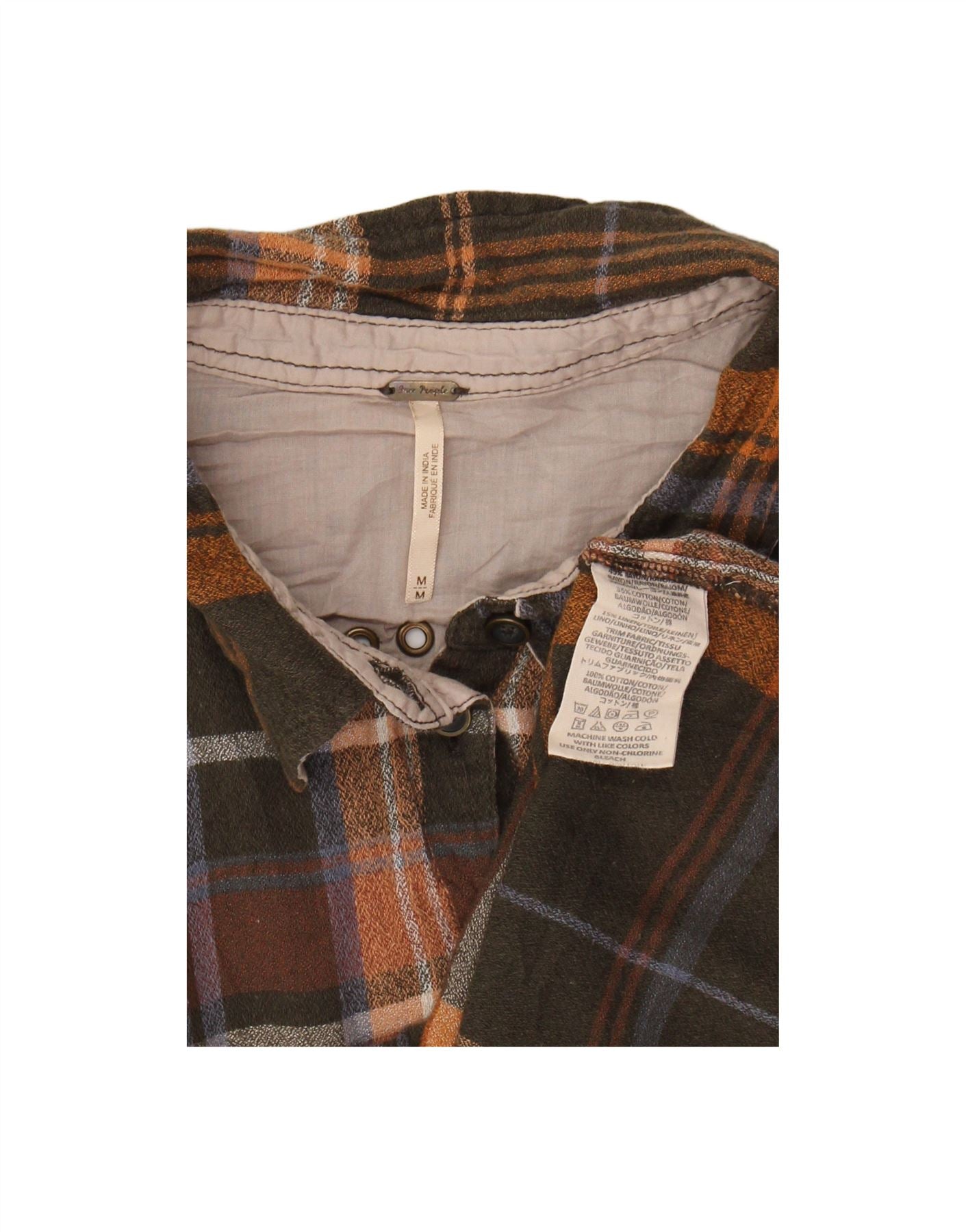 - AI Description: This Free People womens flannel shirt is crafted from soft, 100 cotton flannel. It showcases a rich multicoloured plaid pattern with brown, orange, and blue hues. The classic collared neckline and button-up front create a timeless look. Long sleeves and a regular fit ensure comfortable wear. Practical pockets complete this versatile, standard fit garment.