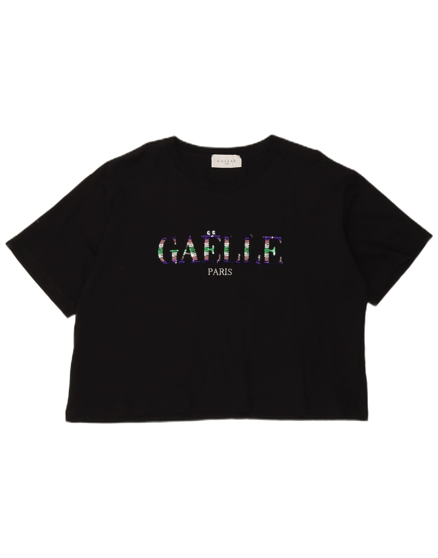 - AI beskrivelse: Denne grafiske T-shirttop for kvinder fra Gaelle er lavet af blødt sort jerseystof. Den har en klassisk rund hals og korte ærmer. Den afslappede pasform giver behageligt slid. Dens afskårne længde giver en moderne silhuet. Forsiden viser et pailletudsmykket Gaelle-logo, der tilføjer et karakteristisk gnistre. Denne pullover-top kombinerer afslappet stil med et strejf af glamour.