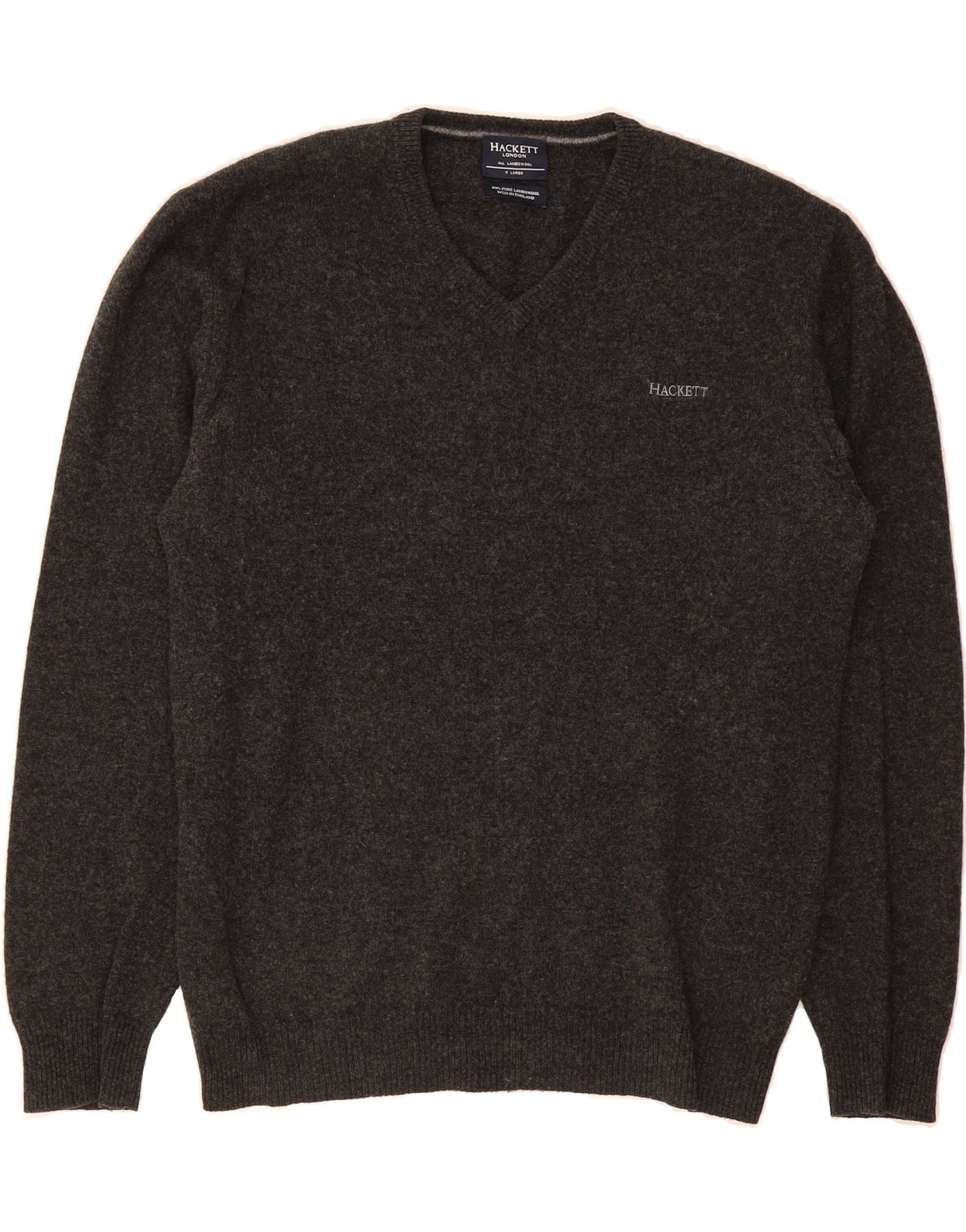- AI Description: Elevate your wardrobe with this Hackett V-neck jumper. Crafted from 100% pure lambswool, this grey knit offers classic style and exceptional comfort. The regular fit ensures a timeless silhouette. Features include long sleeves, a pullover closure, and subtle logo detailing. In pre-owned excellent condition, this jumper is labelled size X LARGE and made in England. A versatile piece perfect for layering. Recommended Retail Price: £60.00.
