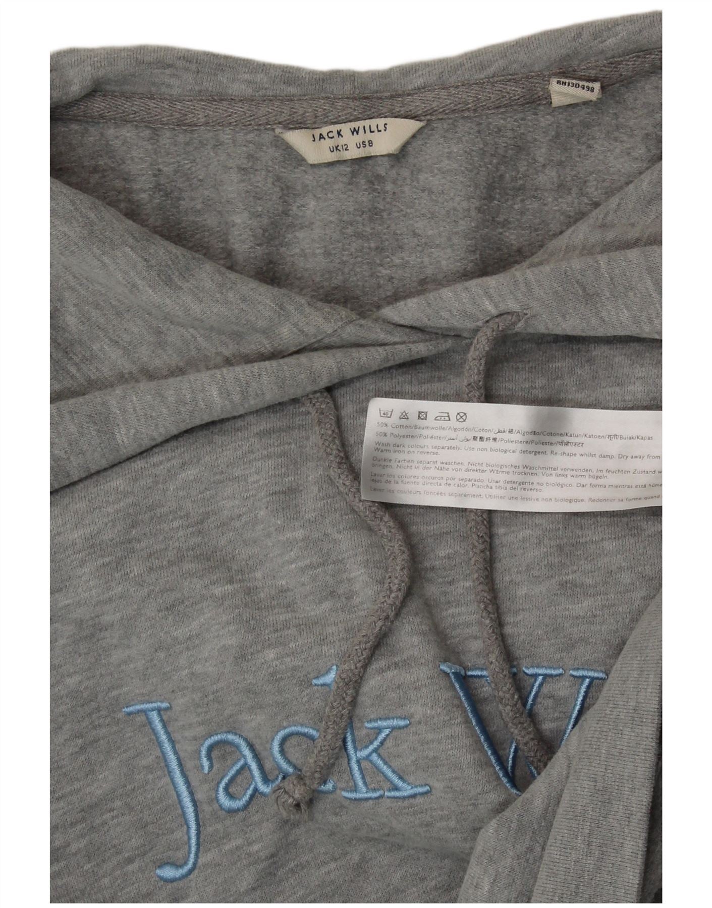 JACK WILLS Dame Crop Grafisk Hoodie Jumper UK 12 Medium Grey Bomuld