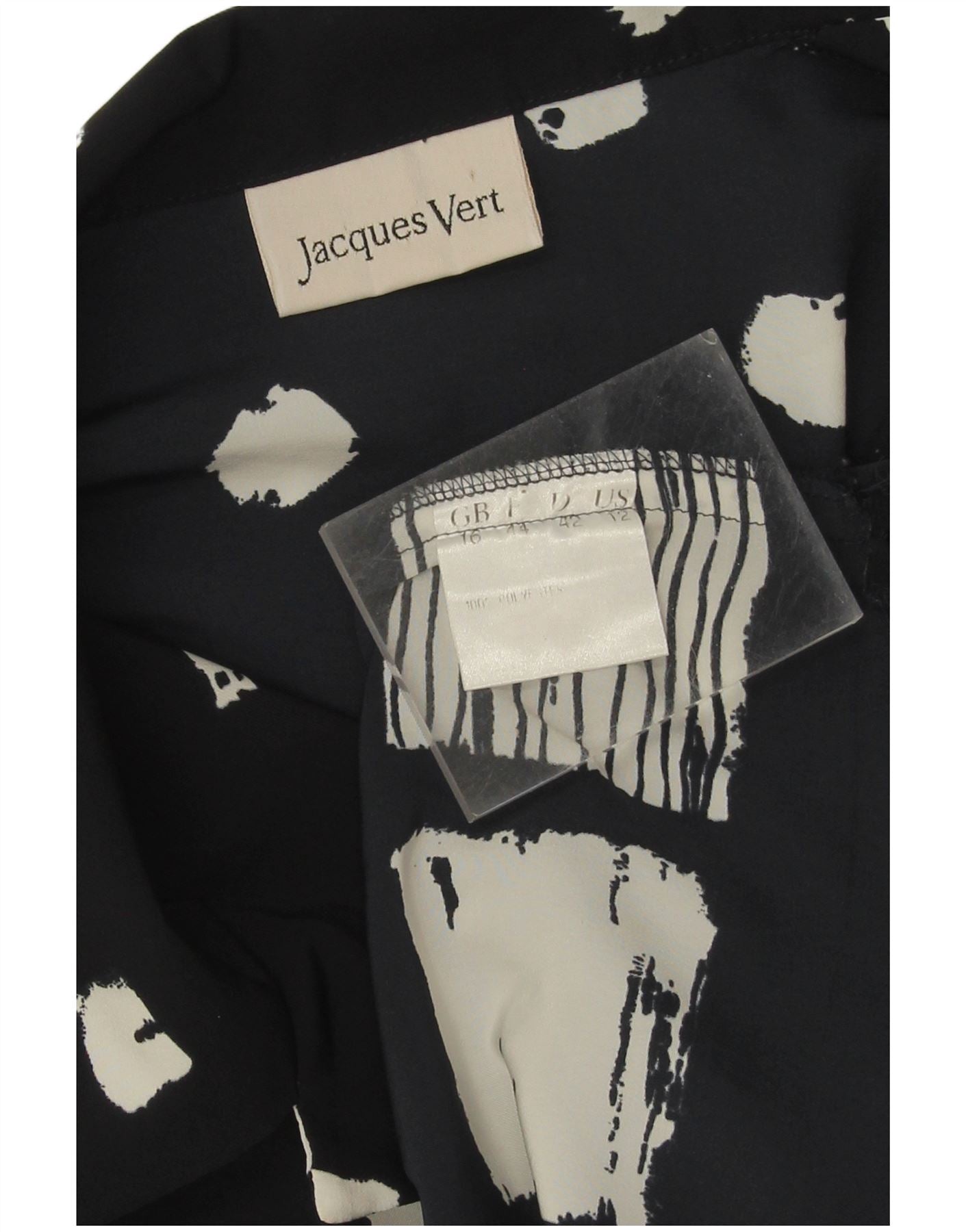 - AI beskrivelse: Denne Jacques Vert skjortebluse til kvinder er lavet af letvægts sort vævet polyester. Den har et slående abstrakt mønster af hvide prikker og en fed blomsterkant. Kraveudskæringen og knappen foran giver en klassisk silhuet. Lange ærmer afsluttes med pæne manchetter. Dens regelmæssige pasform sikrer behageligt slid. Dette retro-inspirerede stykke kombinerer elegance med en karakteristisk visuel appel.
