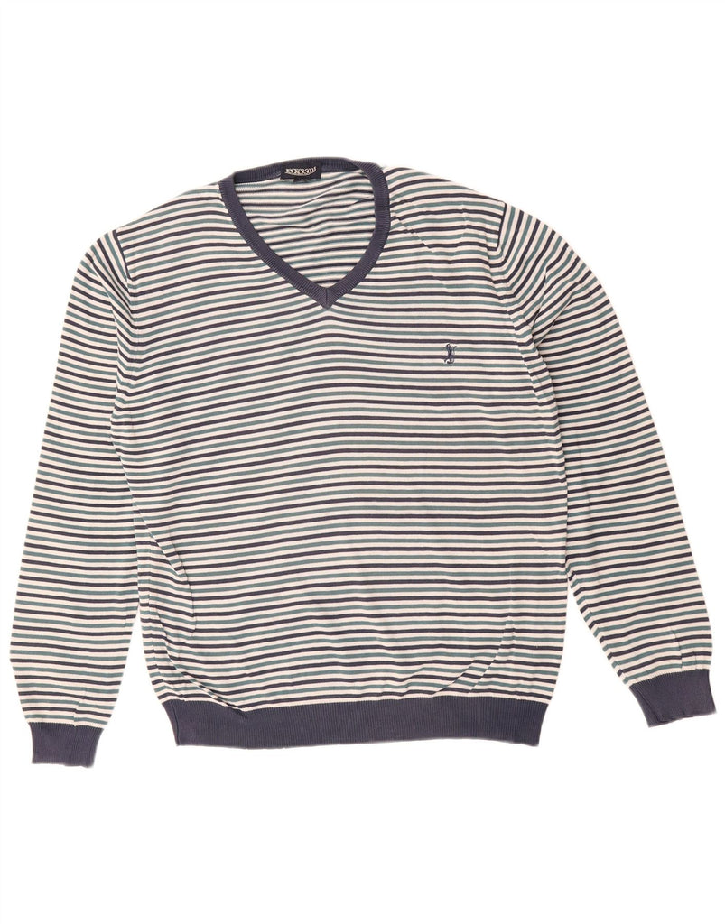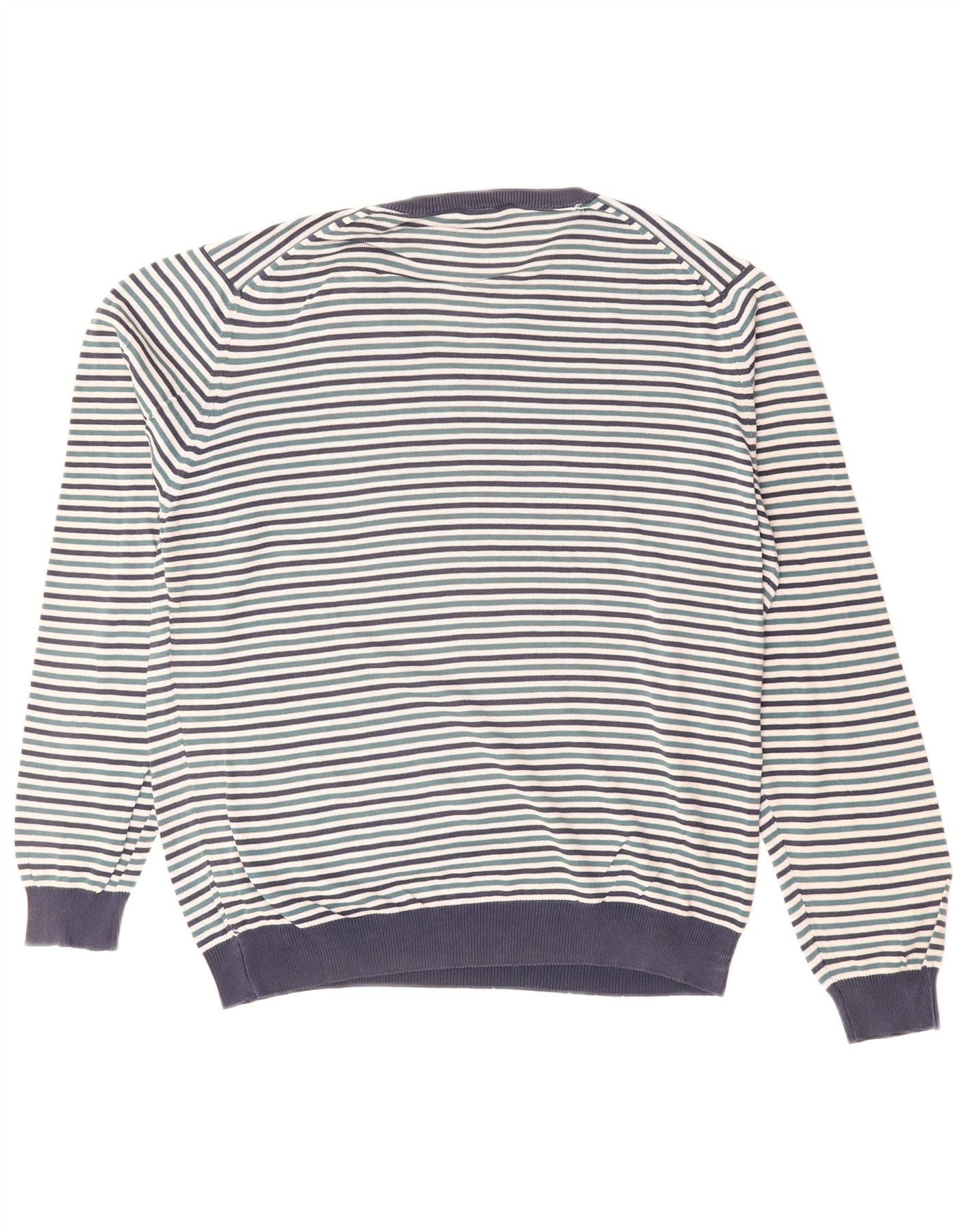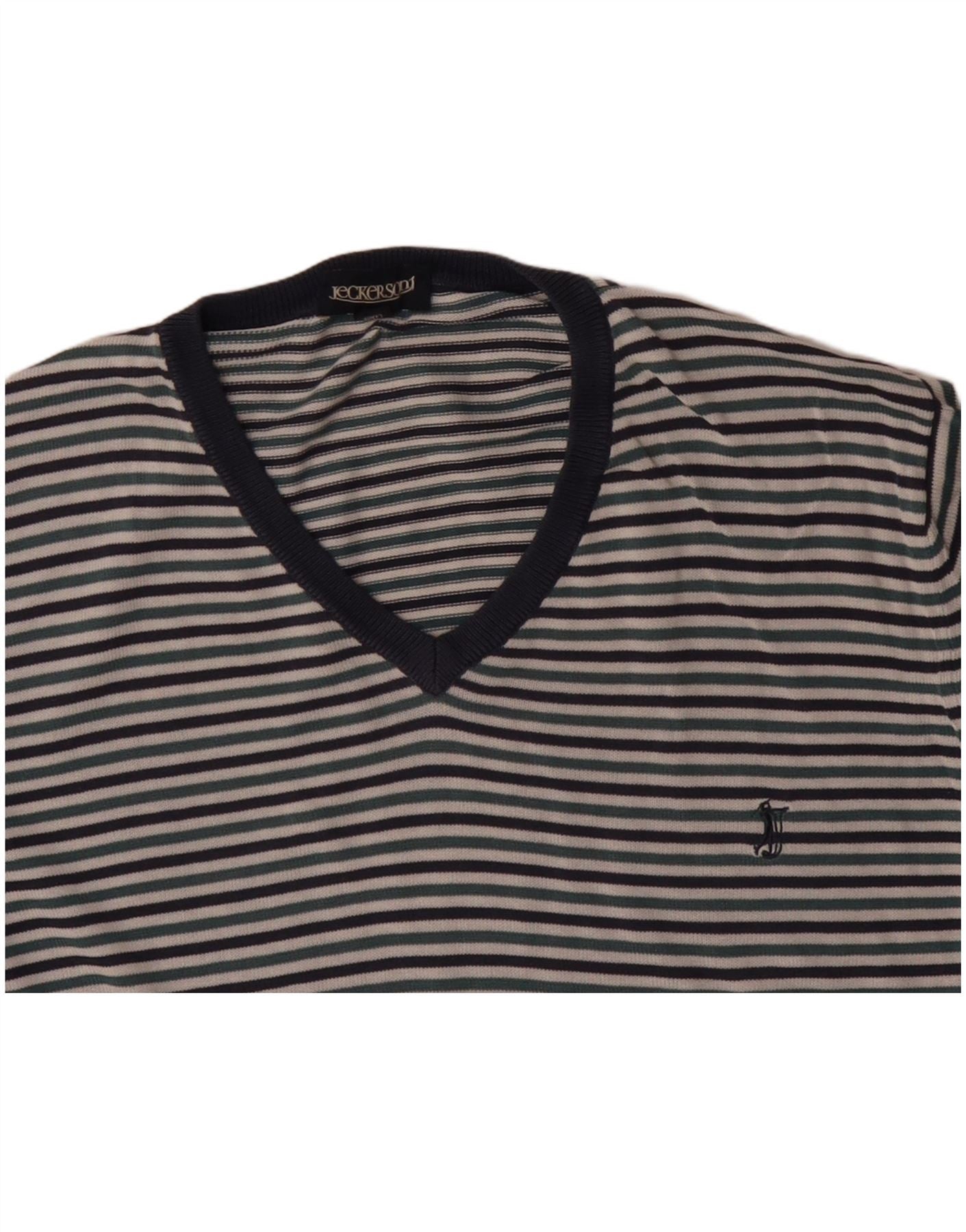 JECKERSON Mens V-Neck Jumper Sweater Large Navy Blue Striped Nautical