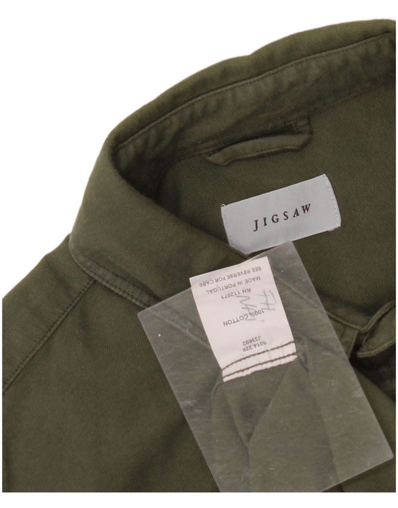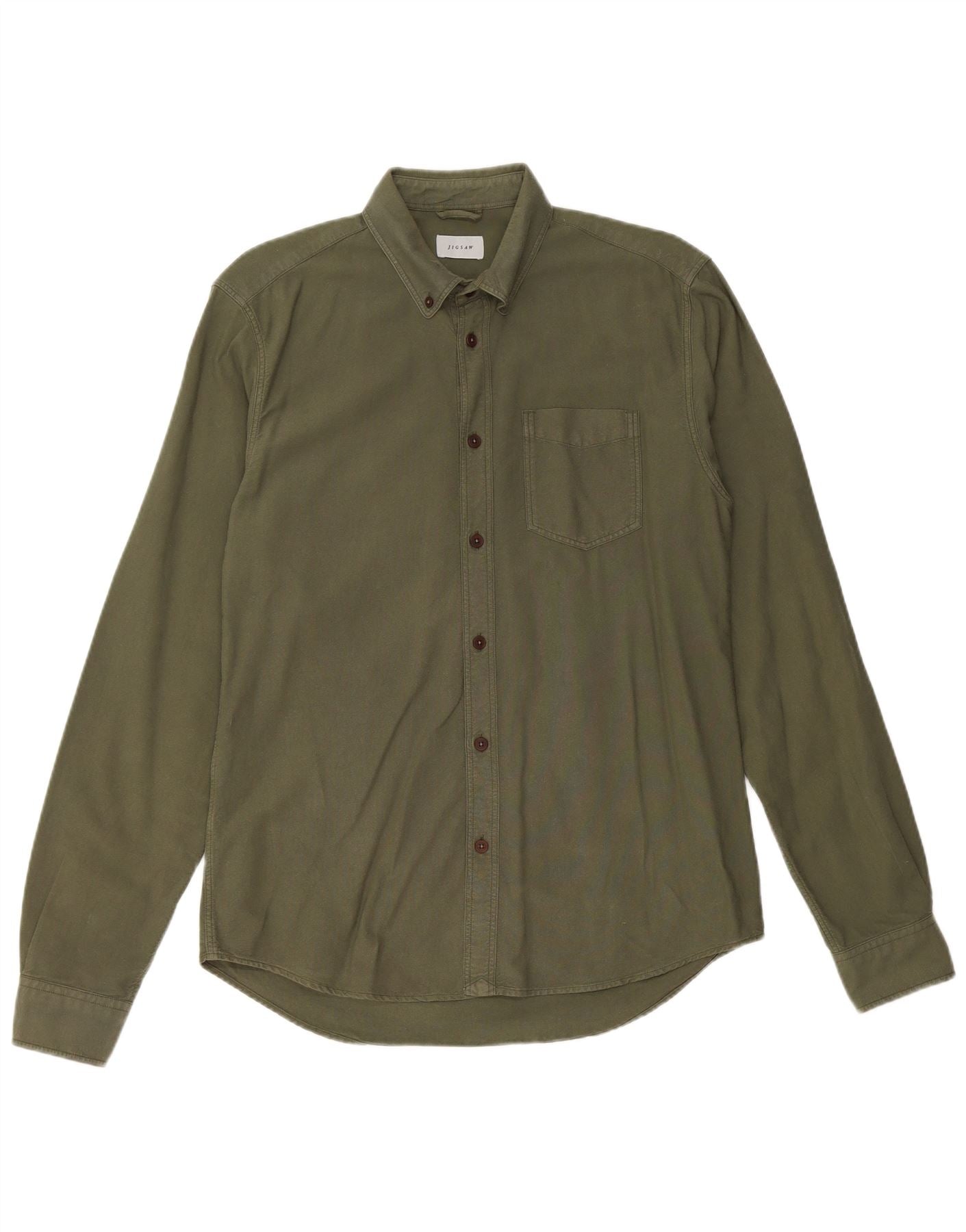 - AI Description: This Jigsaw mens shirt is crafted from 100 percent woven cotton, offering a comfortable feel. The collared neckline and full button-up front provide a classic look. Long sleeves finish with neat cuffs. It features a regular fit for easy wear. Subtle pockets add practical detail to this versatile green shirt.
