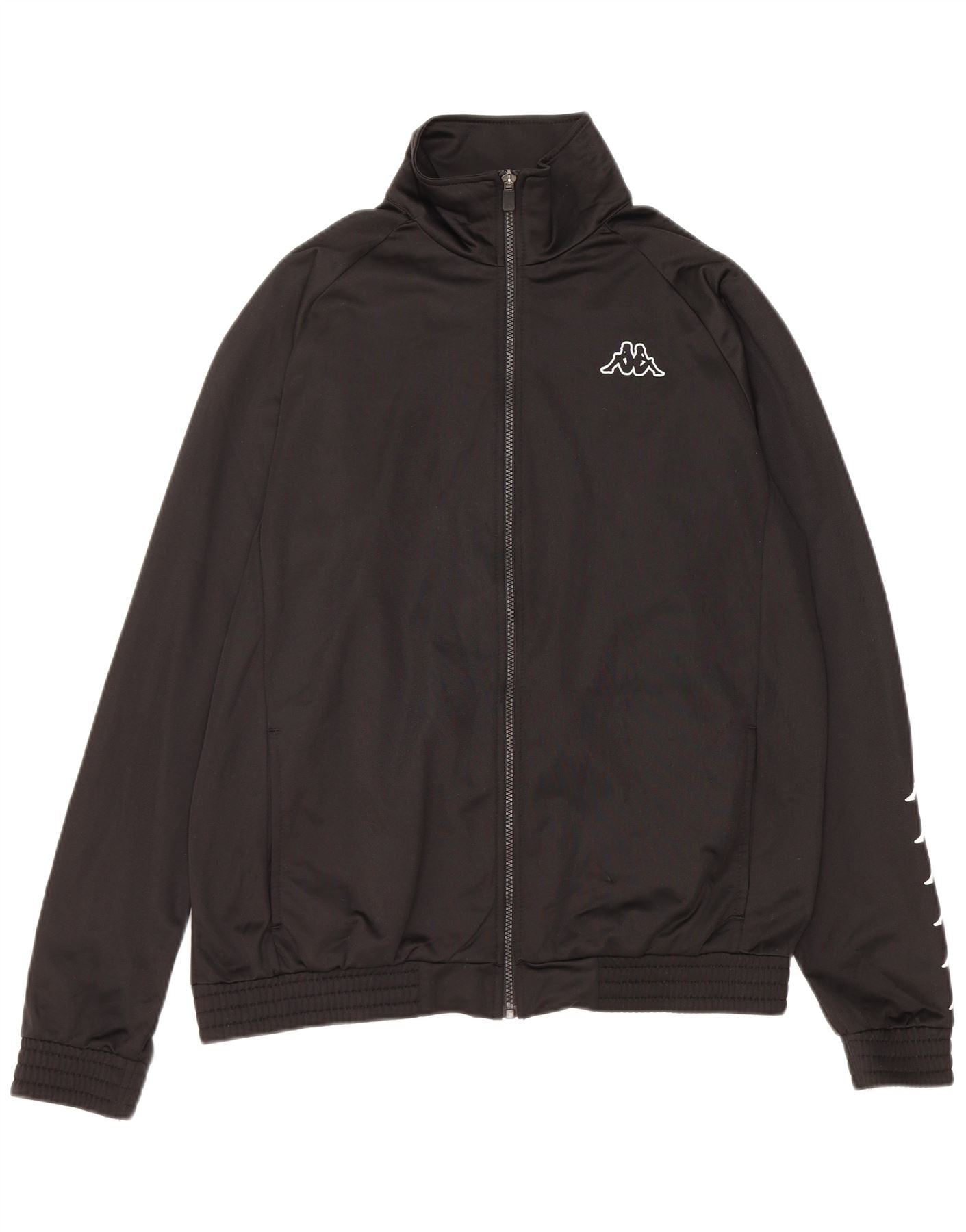 - AI beskrivelse: Denne Kappa træningsjakke til mænd er lavet af glat sort polyesterjersey. Den har en halsudskæring og en fuld lynlåslukning for alsidig brug. Designet med normal pasform inkluderer en elastisk talje og praktiske lommer. Et fremtrædende hvidt logo vises på brystet og gentages ned langs de lange ærmer. Denne sportsstil tilbyder komfort og en klassisk atletisk æstetik, perfekt til aktive forfølgelser.