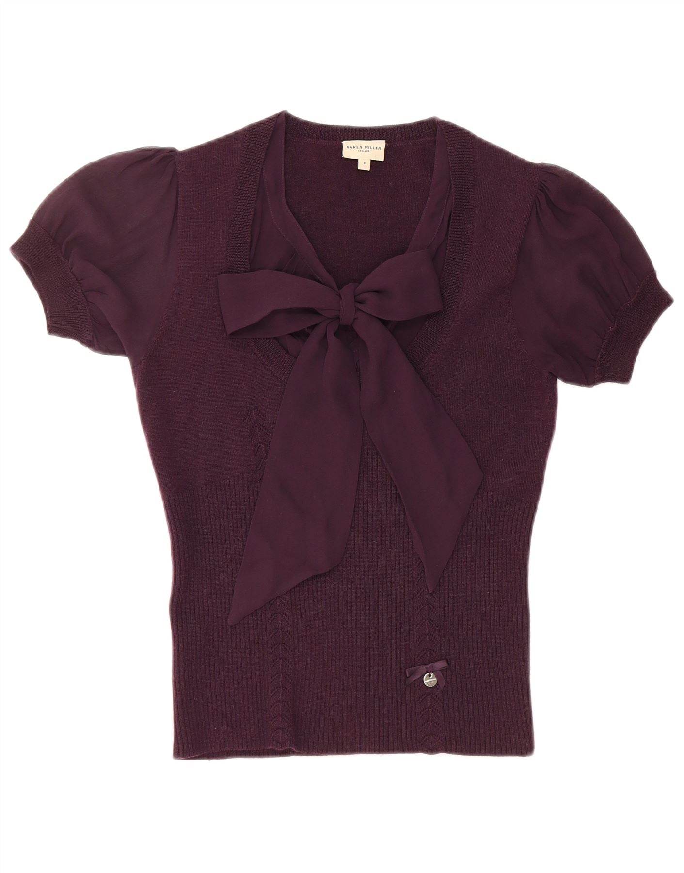 - AI Description: This Karen Millen womens jumper is crafted from a soft knit fabric in a rich burgundy hue. It features a classic V-neckline and short sleeves. The regular fit ensures comfortable wear. A delicate bow accent adds a refined touch. This pullover style offers timeless elegance, perfect for versatile styling.