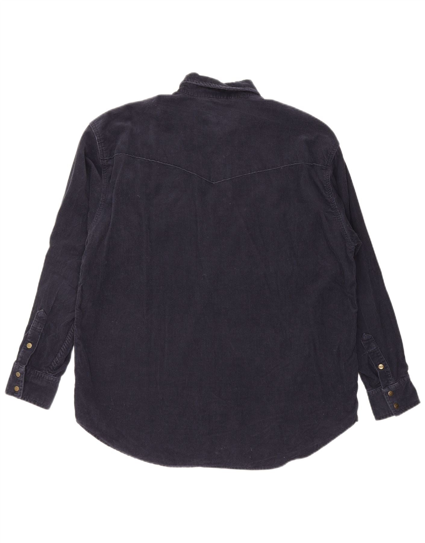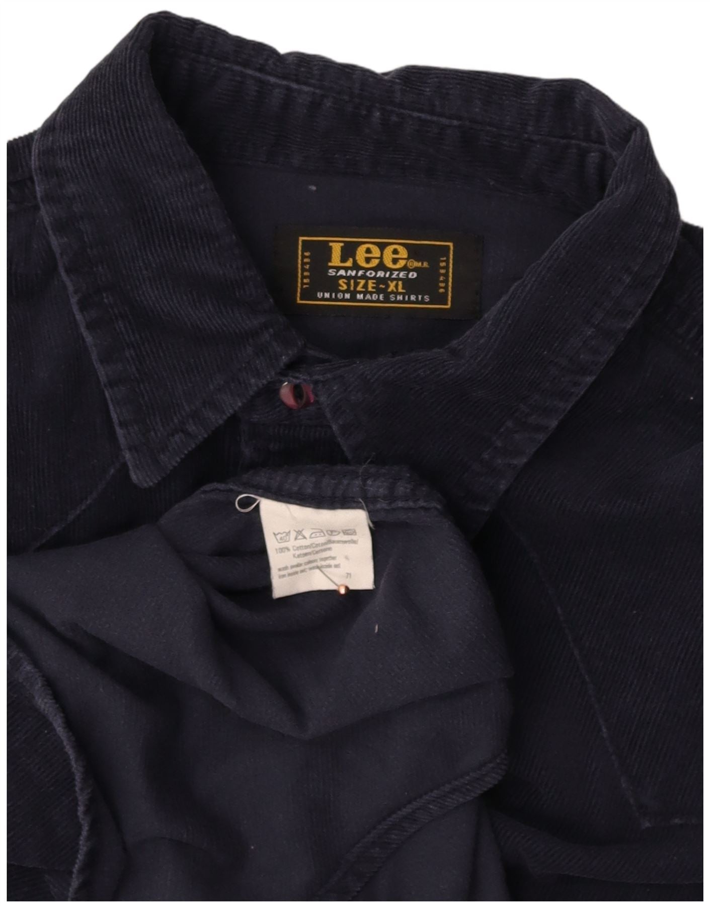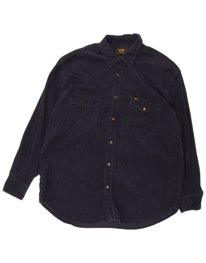 - AI Description: This Lee mens corduroy shirt is crafted from 100 percent cotton corduroy in a rich navy blue. It features a classic collared neckline and long sleeves. The button-up front and regular fit offer timeless appeal. Western-style pockets add functional detail. Tonal buttons complete the classic design.