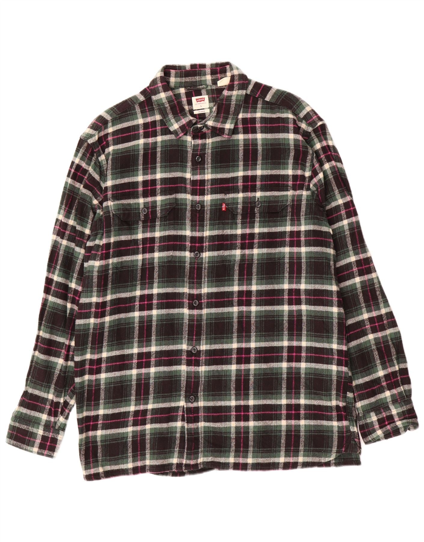 - AI beskrivelse: Denne Levis flannelskjorte til mænd er lavet af blød 100 procent bomuldsflanel. Den har en klassisk halsudskæring og en fuld knap foran. Den afslappede pasform sikrer behageligt slid. Lange ærmer afsluttes med pæne manchetter med knapper. Et karakteristisk plaidmønster i sort, grøn, hvid og pink tilføjer visuel interesse. To brystlommer giver praktiske detaljer. Denne skjorte tilbyder en tidløs, afslappet stil.